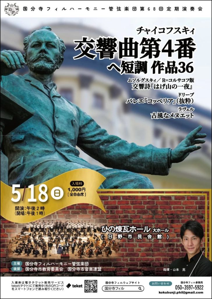最後は、チャイコフスキーの交響曲第4番ヘ短調作品36。"過酷な運命と戦い、それを克服する"というベートーベンの"運命”と同じ図式を、4つの楽章で構成している。第1楽章冒頭のホルンとファゴットのファンファーレが運命の主題で、続いて絶望と甘く優しい夢のテーマが絡み合うが、絶望のまま終了。第2楽章は緩やかなに進み、憂鬱と過ぎし日の思い出がテーマ。第3楽章は、冒頭の弦楽器だけのピッツィカートが印象的だが、何やら空想を巡らしているように過ぎ去る。第4楽章はフィナーレ、様々なメロディーが現れた後に、運命の主題が現れ曲を渾身のパワーで締め括る。国分寺フィルの演奏は、インテンポで突き進む。この大曲は様々な曲想が含まれているので、テンポの緩急や音の強弱にメリハリがあるともっと良かったと思う。