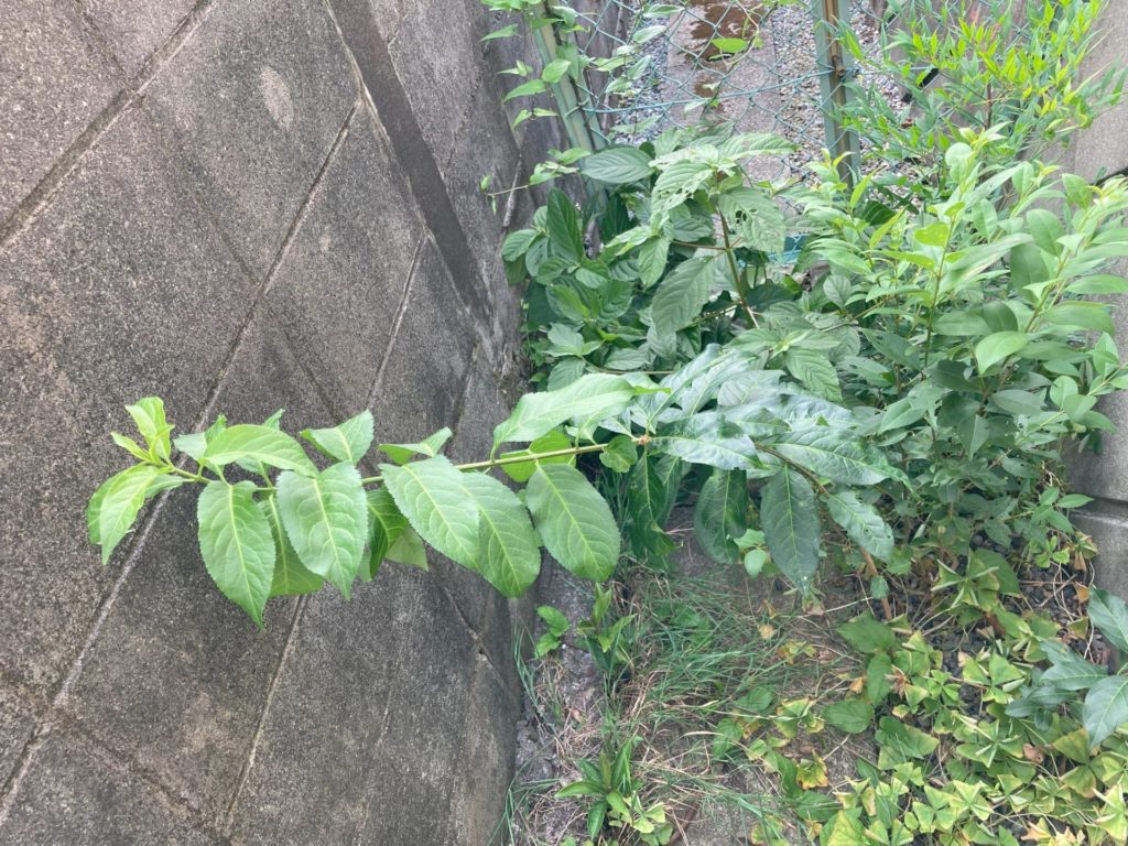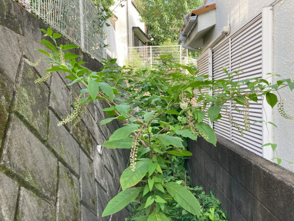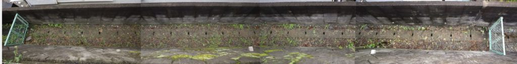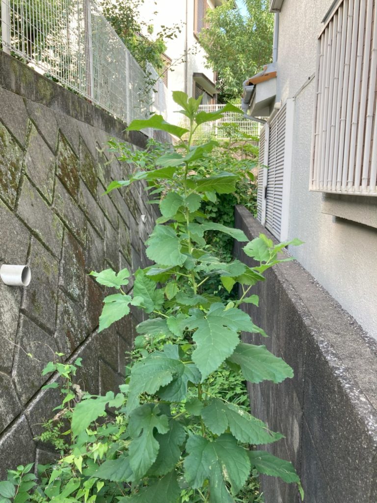 現在居住している住宅は、丘陵地を切り開いて住宅地を造成したため、段々畑のように隣接する住宅地とは高低差がある。このため、宅地周辺の一部は法面になり、コンクリートの壁で囲まれている。このような構造にすると、宅地を強固なものにするため、法面に何本かのパイプを通し排水が出来るようにしてある。法面の下から隣家の壁までの幅は1m程度で、その中央には法面からの排水を通す暗渠水路が埋め込まれており、その両脇に僅かにのぞく地表面には小石を敷き詰めている。しかも、両側を壁で囲まれたこの緩衝地帯は陽当りが悪いので、それほど雑草は繁殖しないだろう…と思うのは大間違い。毎年、盛大に雑草が茂り、夏には成長した雑草の草刈り、冬には枯れた雑草の除去が必須となり、年2回のビッグイベントになっている。今回は、夏の草刈りをした。