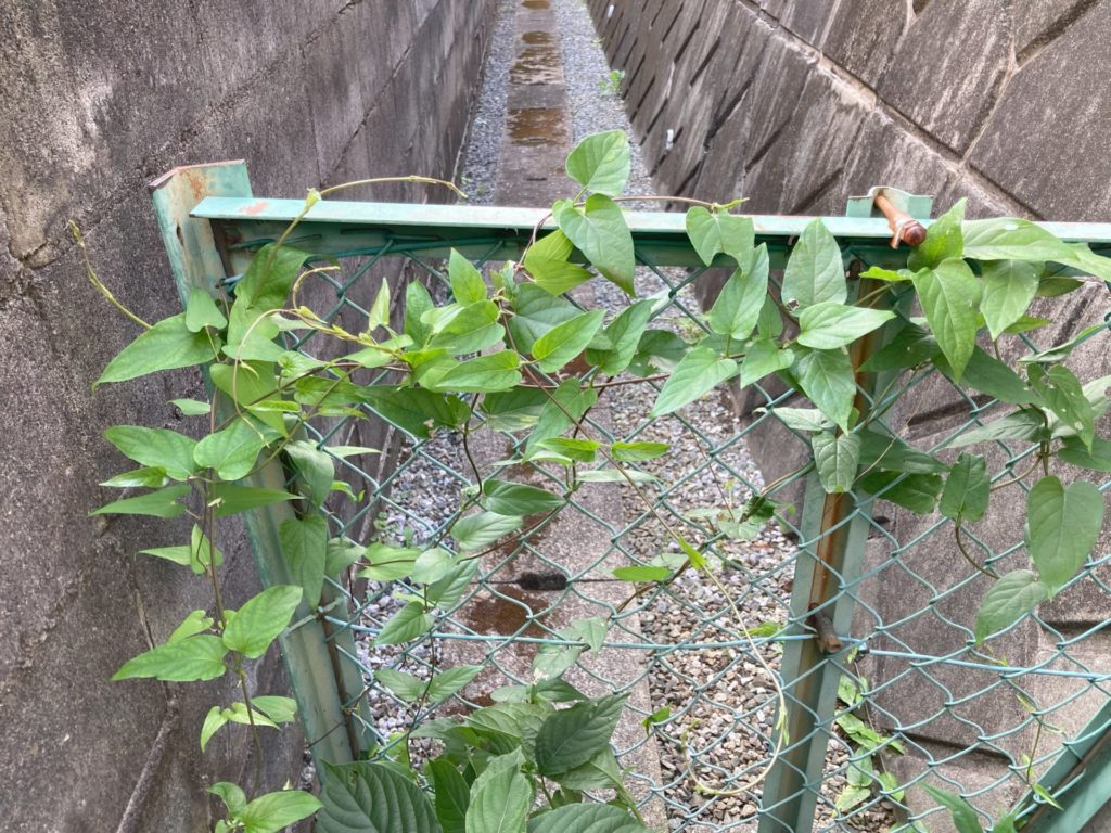 蔓性で葉の形から判断。かつて法面の上のフェンスまで伸び、花を咲かせたことがある。地下茎が生きており、また成長を始めたのだろうか。