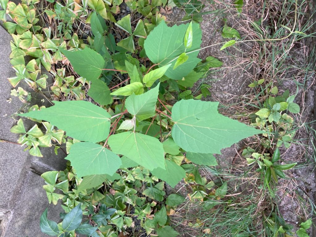 葉の形や、新芽や葉柄が赤みがかっているので、アカメガシワだろう。典型的なパイオニア植物で、成長が早く、強力な繁殖力を持つ。果実は大量に稔るが、鳥によって運ばれたのだろうか。