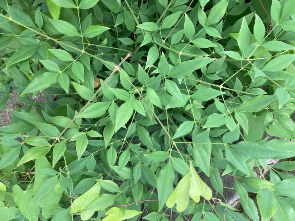 これは、赤い実のなるナンテンの若い株で、葉の奇数羽状複葉が特徴。当地では、あちこちに自生している。鳥によって果実が拡散されたのだろう。