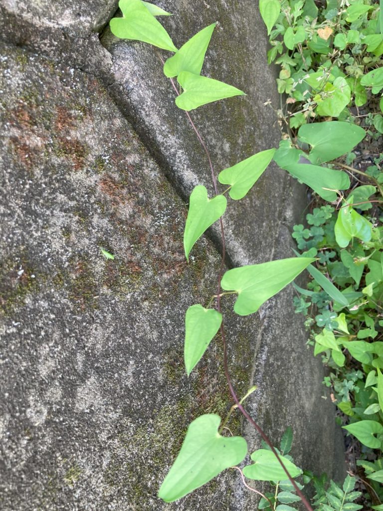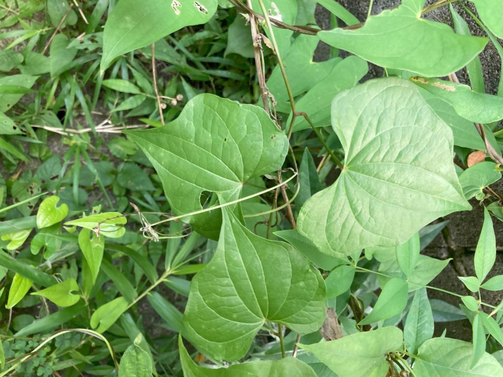 葉は対生で長いハート形をし、蔓性でもあるので、ヤマノイモだろう。これは、地中にできる芋をすり潰してとろろにして食用にするあのジネンジョ(自然薯)のことだ。しかし、この小石混じりの硬い土地では、とてもそこまでには生育できないだろう。何故、ここに生えたのだろうか、むかごによるものだろうか。
