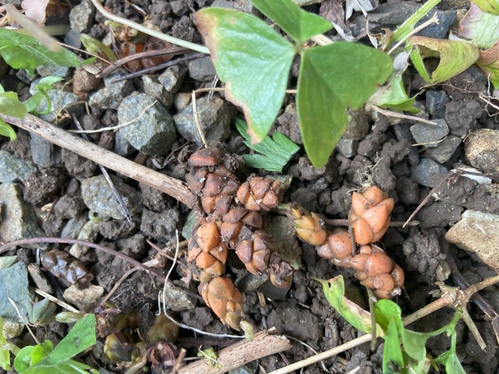 これも、蔓性であり葉の形から判断。何故、この地に生えたのか、地中の種芋によるものか、それともむかごが運ばれてきたためだろうか。この硬い土地では、芋が大きくなるとは思えず、むかごを残すだけで精一杯だろうか。