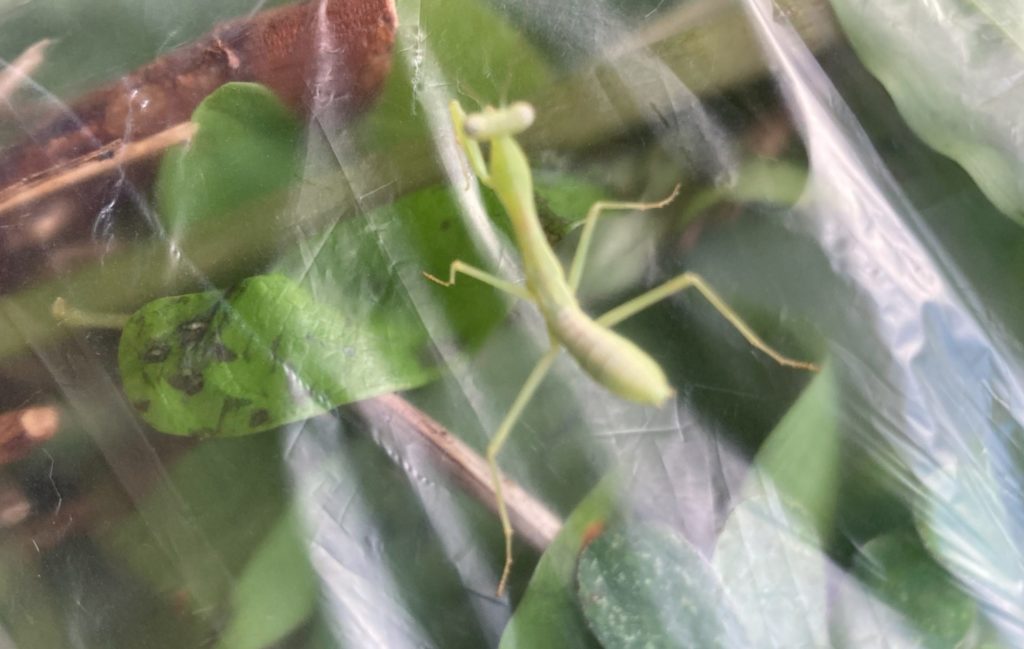 2時間に及ぶ草刈りの後、葉や枝をビニール袋にまとめていたら、小さなカマキリの幼虫が袋から飛び出した。雑草まみれのこの緩衝地帯は、昆虫にとっては居心地の良いマイホームだったのかもしれない。世に雑草地帯は尽きること無く存在するので、新居での新たな生活を始めてほしい。