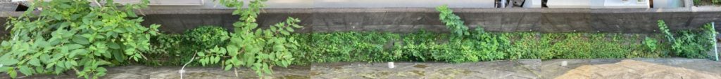 草刈りの対象となる緩衝地帯は、長さが10m、幅が1m程度の細長い地形。長手方向の両側は法面と壁が立ち、短手方法の両端には高さ1m程の鉄枠付き金網があり、区画の境界表示と不審者侵入防止の役割を果たしている。緩衝地帯を上から見ると、地表が見えないくらい様々な雑草が占有している。今回は、折角の機会なので、どのような植物が生えてきたのか調べてみた。