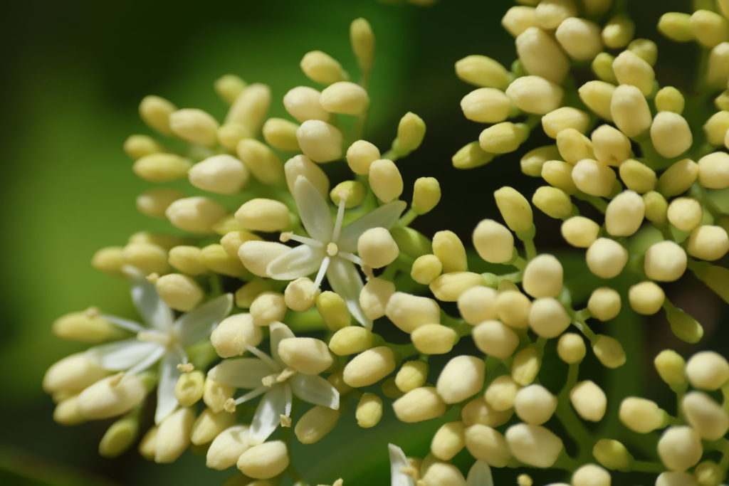 新しい枝先から散房花序が出て、上向きに多数の蕾をつける。散房花序の上方は、緩やかな曲面を描き、その中の蕾が三々五々に花に変わっていく。花枝に対し花柄は互生し、その先に緑色の萼筒を介して花がつく。花は両性花で、中央に雌蕊が1本と黄色い葯をつけた雄蕊が4本、そして白い長楕円形の花弁が4枚で構成されている。樹木全体の中では、枝が横方向に伸びて、その上方に多数の花序が連なり、満開時にはこれらが層状に重なるので、見事な景色になる。