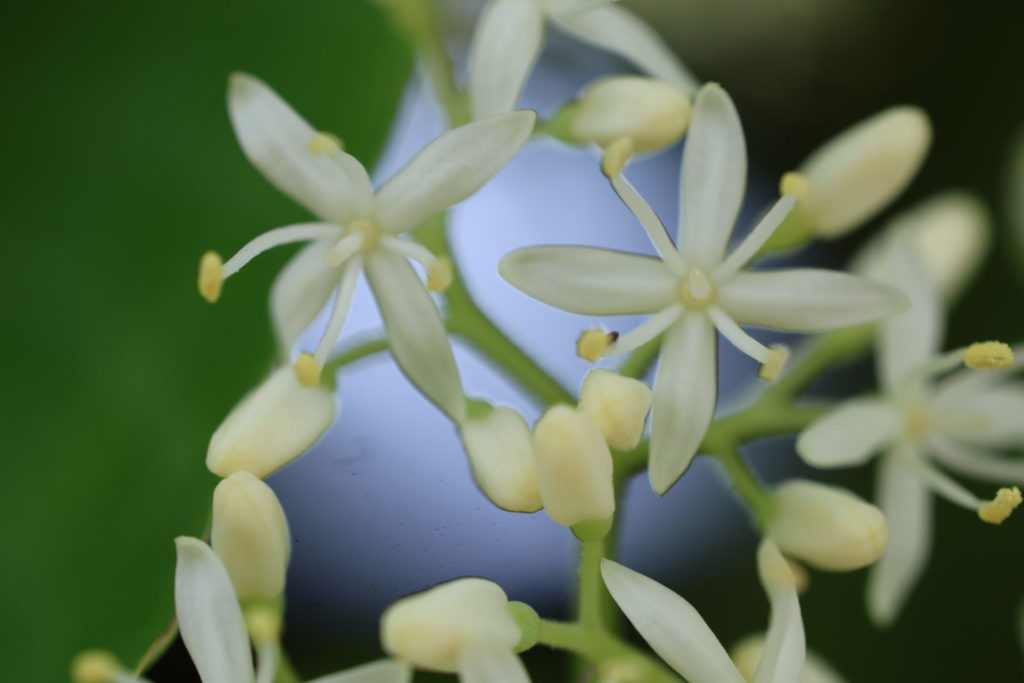 ミズキ(水木)は、ミズキ科ミズキ属の落葉広葉高木。東アジアの原産で、日本の在来種でもある。春のミズキは根から水を吸い上げ、枝を折ると水が滴り落ちるので、この名がついた。また、ミズキの枝は横方向に伸びる性質があり、これが幹から輪のように分岐するのでクルマミズキ(車水木)の別名がある。この構造によって、横方向の枝に沿って上方には白い花、下方には緑の葉の帯模様が連なる。更に、上下には別の枝もあるので、離れて眺めると、まるで樹木の中に幾つもの階段があるような印象を受ける。この姿はユニークで華やかさがあり、直ぐにミズキだと気がつく。また、夏から秋にかけて、果実が緑から紫を経て黒く変化する様子も素晴らしい。木材としては、成長が早く、軟らかく緻密で加工しやすいので、コケシや箸、漆器の木地、寄木細工、薪炭等に使われる。古くからの在来種ではあるが、実用面以外では人との関わりは少なく、文化的な寄与は少ない。基本的に自生する大きな樹木なので、観賞用に民家の庭に植栽されることはまず無く、最近では植物園や大きな公園でも良く見かけるようになった。