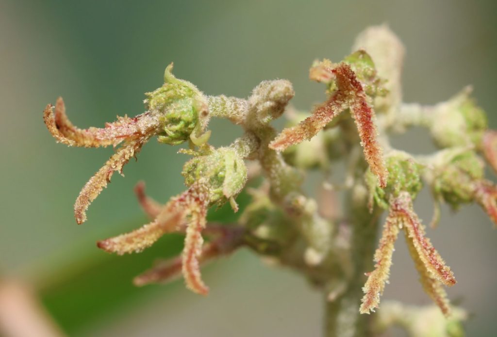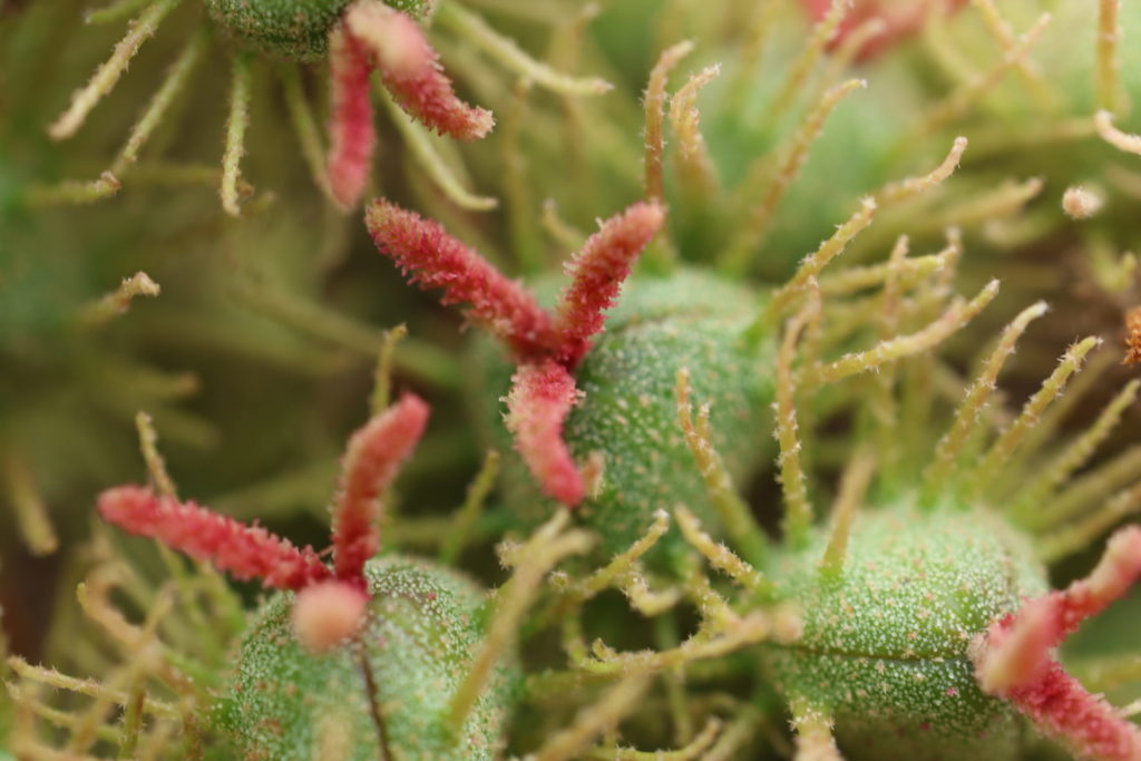 雌株の茎先の葉の脇から、雌花の円錐花序が伸びる。雄花と同様に、雌花にも花弁は無く、萼に包まれた棘のある子房から3本の花柱が伸びる。やがて、この子房が生育して果実になる。