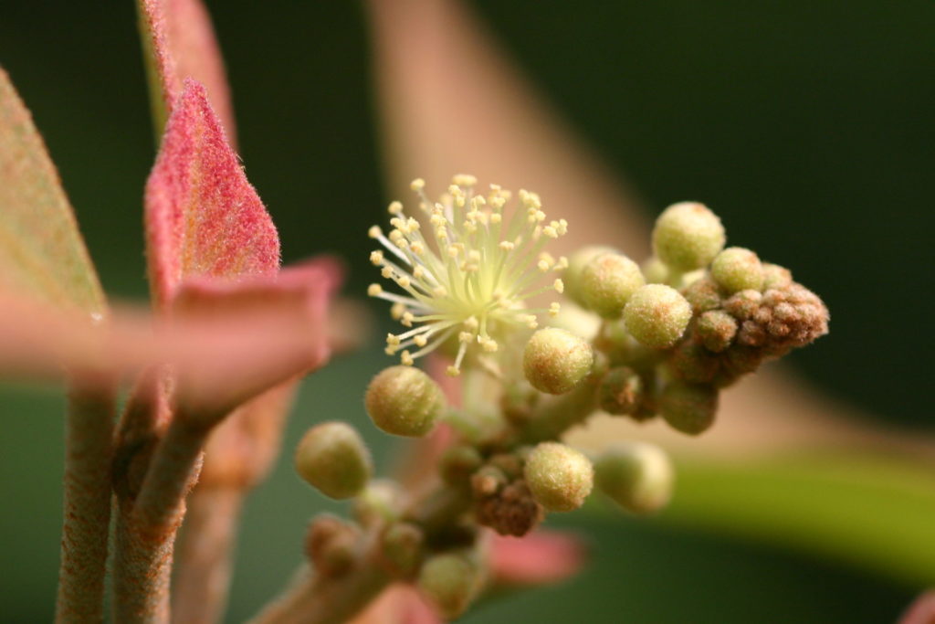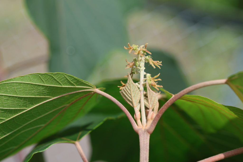 雌雄異株のアカメガシワには、雄株に雄花が、雌株には雌花がつく。茎先の葉の脇から、円錐花序が伸びるのは、雌雄共通だ。雄株の場合は、円錐花序には球形の蕾がつき、それらが順次開花する。雄花には萼はあるが、花弁は無く、長い花糸を持ち、先端に黄色い葯をつけた多数の雄蕊が球形のように展開する。雄花は、花序の基部から先端へと咲き進む。