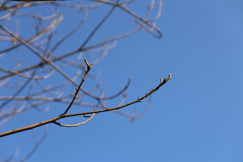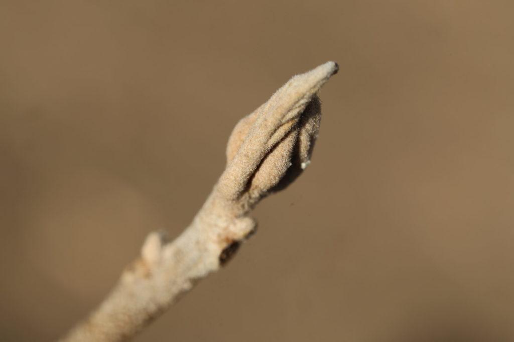 アカメガシワは冬には落葉し、枝の先端や節々に冬芽がつく。一般の冬芽は芽鱗で覆われることが多いが、アカメガシワの冬芽は淡褐色の星状毛が密生する裸芽だ。