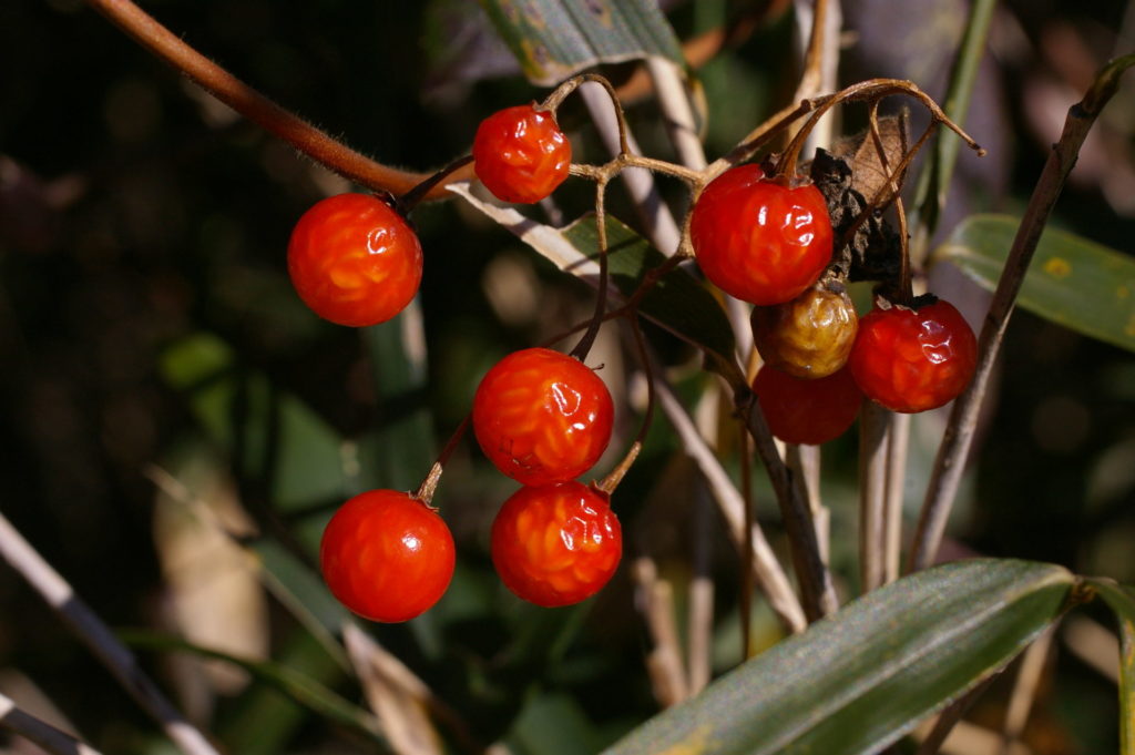 花が終わると、花被片や雄蕊、雌蕊が落ち、子房が成長して緑色の若い果実になる。果実は生育するにつれ、果皮は緑色から赤へと変化する。果実は液果で、陽が当たると、果皮を通して多数の種子があるのが分かる。冬になると果皮に皺がよるが、枝に残るものも多い。この赤い果実は、人間にとっては有毒だが、餌の少ない冬にはヒヨドリなどの野鳥が集まる。