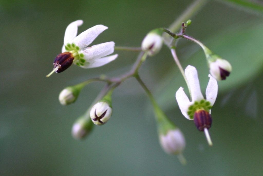 ヒヨドリジョウゴは雌雄同株で、花は両性花。茎につく葉の腋から、集散花序を出し多数の蕾ができる。同じ花序でも、蕾から花になる時期に多少時間差があるようだ。蕾の先が割れて開花すると、白い花冠が深く5裂し、後方に反り返る。花冠の基部には緑色の斑点があり、黄褐色の葯をもつ雄蕊が5本あり、雌蕊の花柱が突き出る。他のナス科の植物と同様に、花粉は葯の先端の穴から放出される特殊な構造をしている。