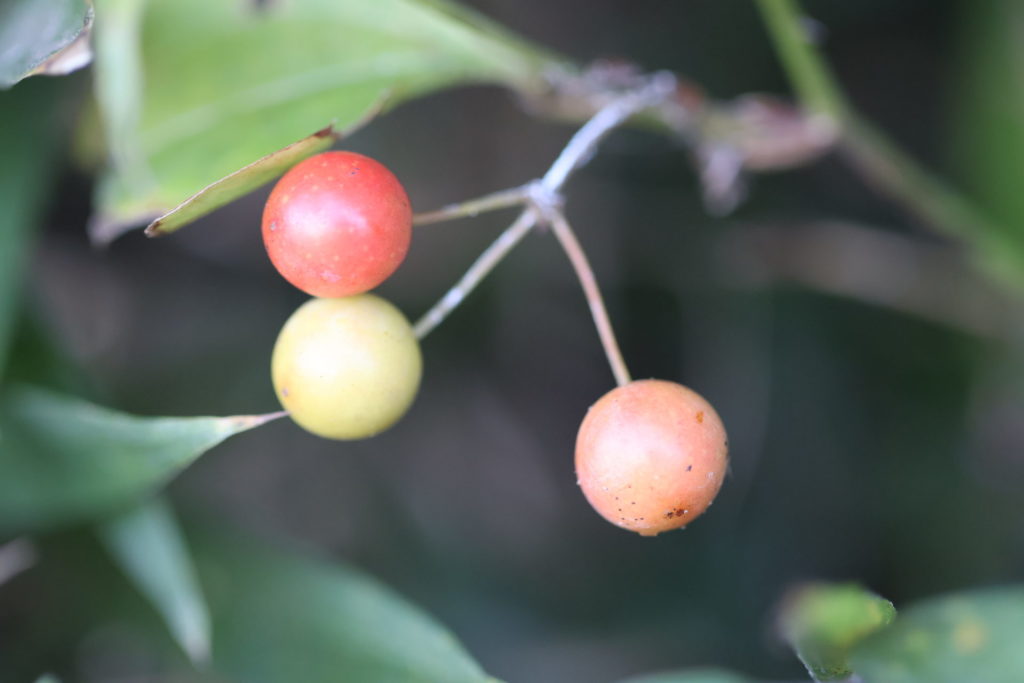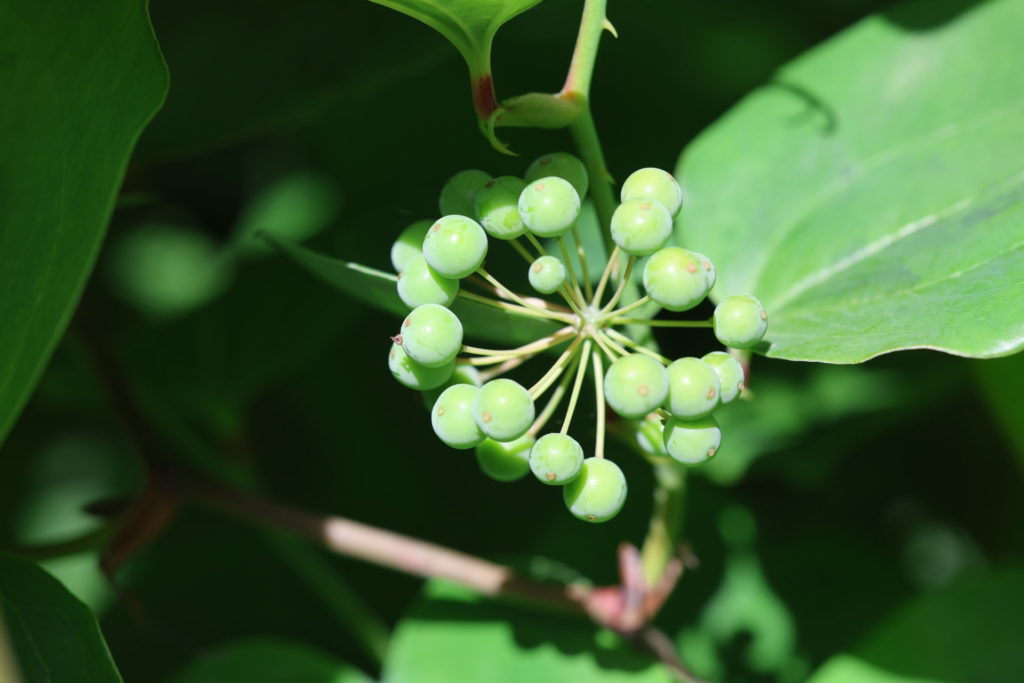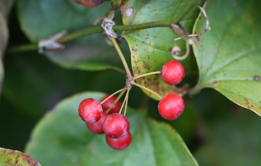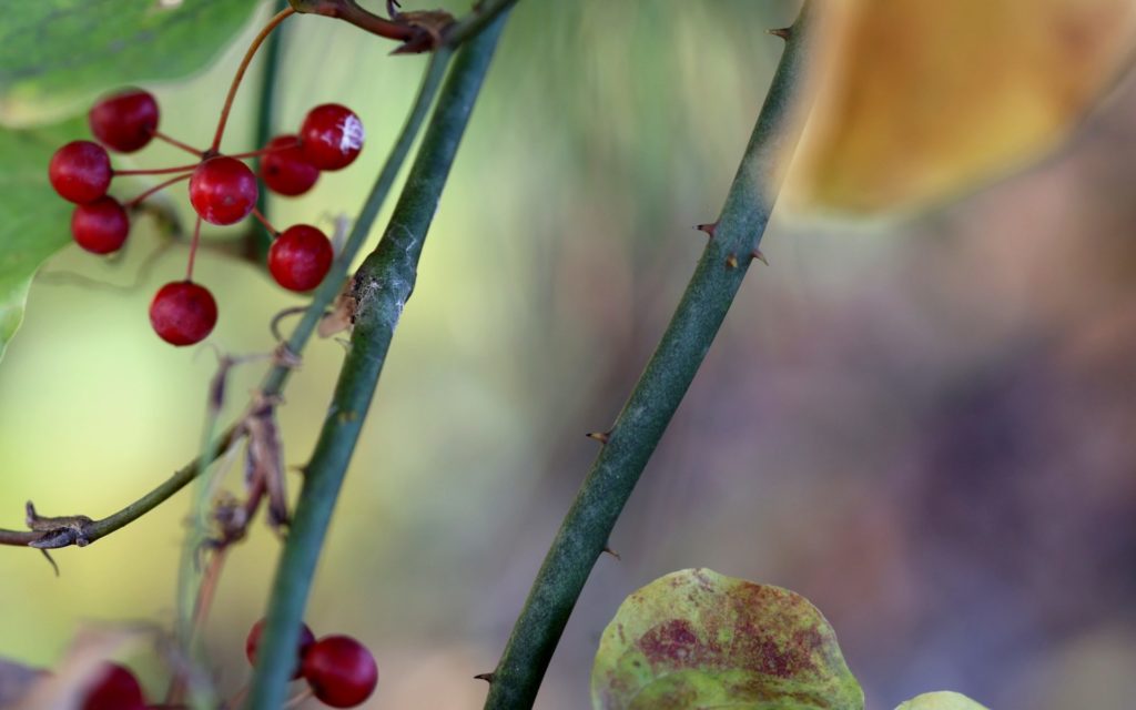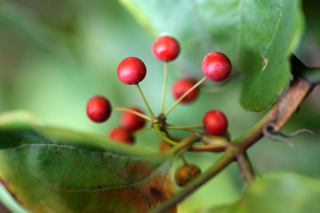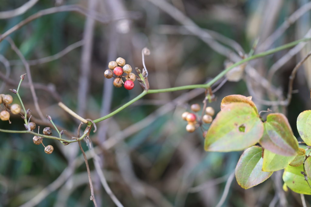 サルトリイバラ(猿捕茨)は、サルトリイバラ科シオデ属の落葉植物。蔓性だが、草本ではなく半低木。日本の在来種であり、全国各地の山野に自生するので、割と知られた存在だ。サルトリイバラの名の由来は、蔓性の茎に棘があり、これが繁茂すると猿でさえもも脱出できず捕らえられてしまうと言う説がある。また、別名のサンキライ(山帰来)は、梅毒を患って山に捨てられた男が、この植物の根を薬にして治癒し、村に帰ってきたという故事に由来する。植物としての姿も風変わりだ。長く伸びた枝には棘があり、葉の付け根には2本の長い巻きひげがつき、隙あらば他の樹木巻き付き、大きな葉で覆い尽くす。花は黄緑色で目立たないが、その代わり秋に放射状につく赤い実には際立った存在感がある。人間との関係も深い。サルトリイバラの葉は、丸くて大きく、物が付着しにくい性質があるため、柏の葉の少ない西日本では、餅などを包んで炊くのに利用した。また、根茎は乾燥させると生薬"和山帰来"となり、解毒作用や利尿作用があり漢方薬になっている。また、秋に赤く熟す果実は水分が少ないため花材として生花やクリスマスリースにも適している。しかし、野生種であっても繁殖能力は程々なので、もし散策中にサルトリイバラに遭遇したら、幸運な気分になる。