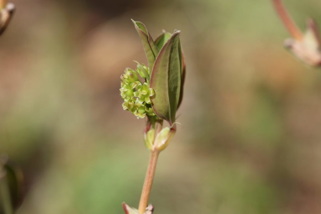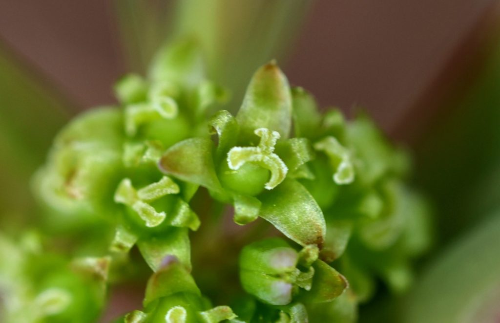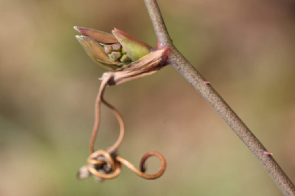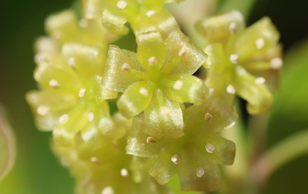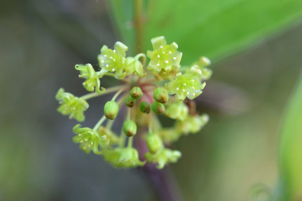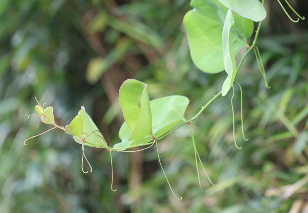 春になると新葉に囲まれて、蕾が出てくる。蕾が成長すると、放射線状に広がった散形花序の先に花がつき、ボリューム感があるが、花の色が黄緑色なのであまり目立たない。サルトリイバラは雌雄異株なので、雄株には雄花、雌株には雌花がつく。雄花の構造は、6枚の花被片があるが、内側の3枚は小さく、外側の3枚は大きく、それぞれが反り返っている。中央部には、雄蕊が6本ある。雌花の花被片も大小各3枚でやはり反り返り、中央部の雌蕊の柱頭は3裂する。