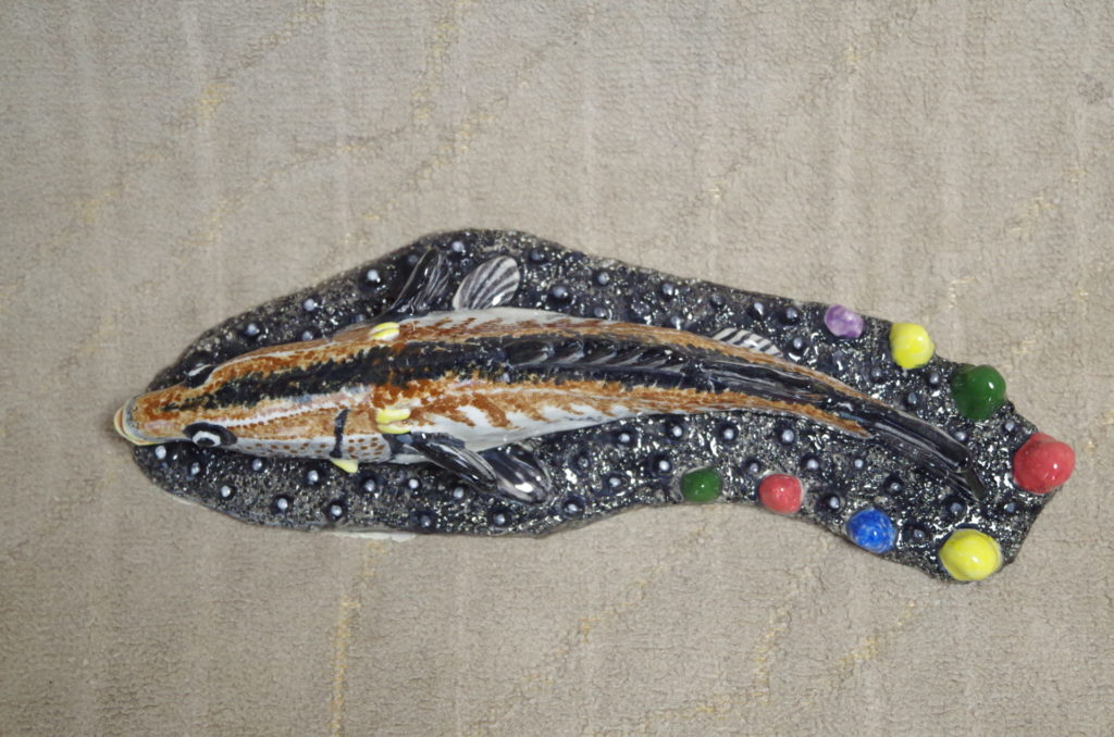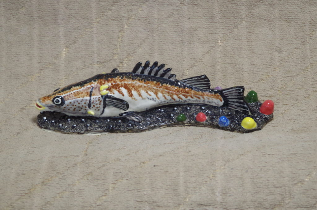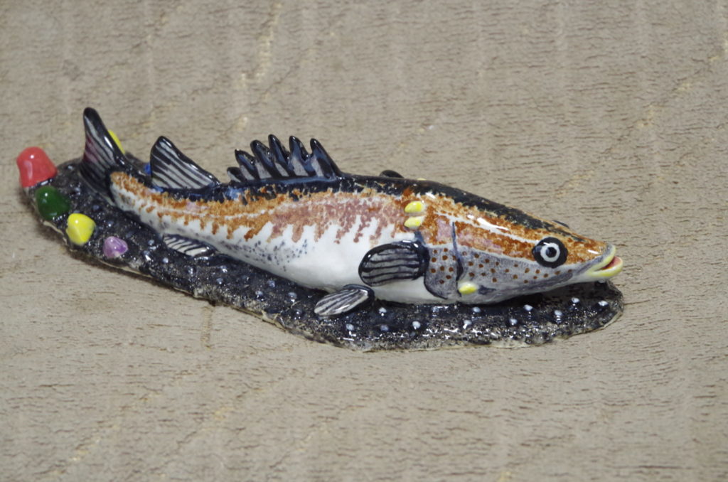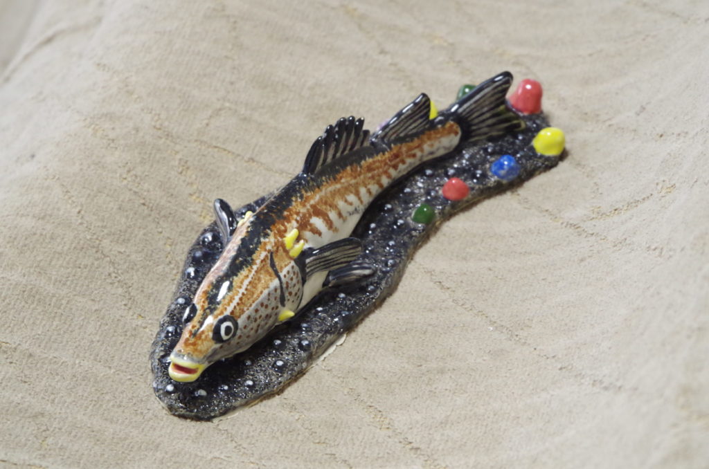 アラの造形は、厚みのある胴体とやや尖った頭部を、違和感なくスムーズに繋ぎ合わせることが結構難しい。それと、アラ特有の鋭い背鰭やエラのトゲは目立つように表現すること。出来上がった形状は、他の魚と区別できそうな個性は表現できたかもしれない。しかし、高級魚かどうかは、陶器は硬くて食べられないので分からない。【2025年制作】