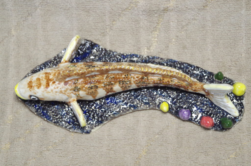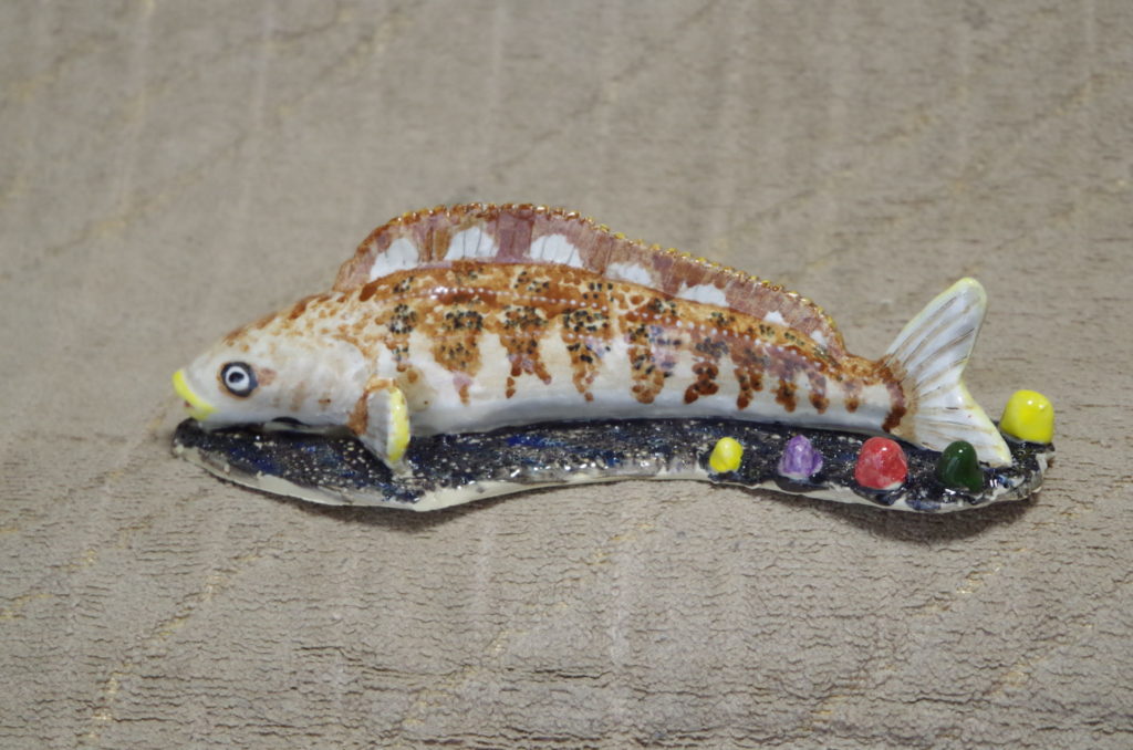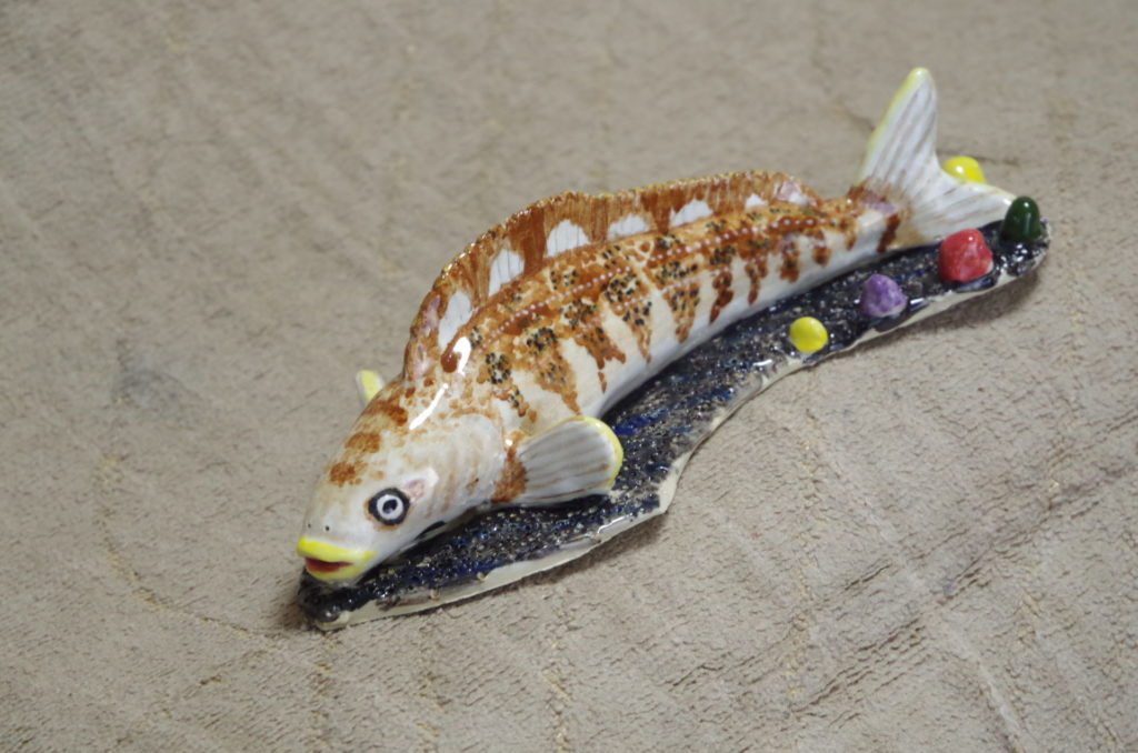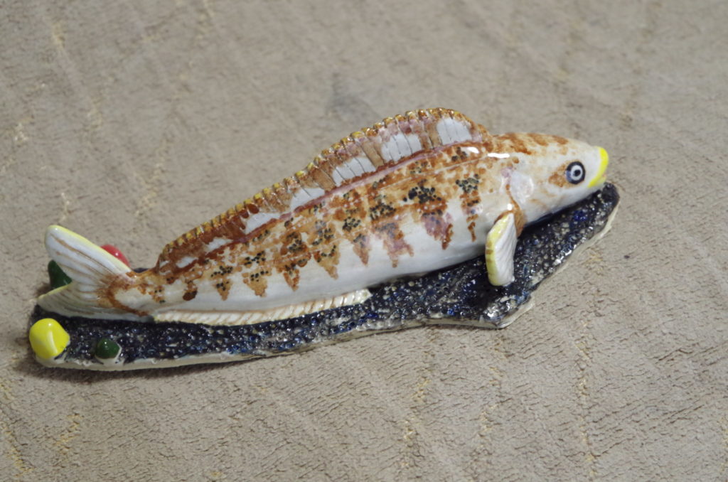 ホッケの物理的な魚体の形状は明確だが、割と普通の魚に見えるので、これは模様で勝負するしかない。しかし、体側の模様や色の濃淡は個体によって異なるようなので、なかなか筆が進まない。点描でいい加減に色をつけていったが、何やらマホッケよりシマホッケに近くなってしまった。これなら、一層のことホッケの開きを作陶すれば良かった。【2025年制作】