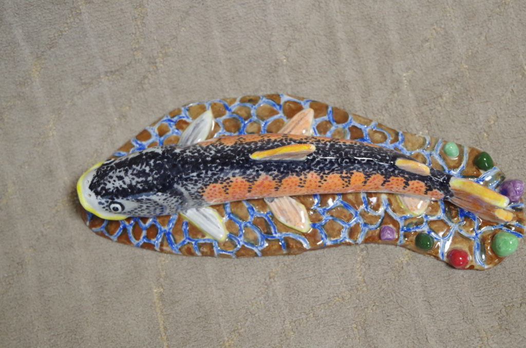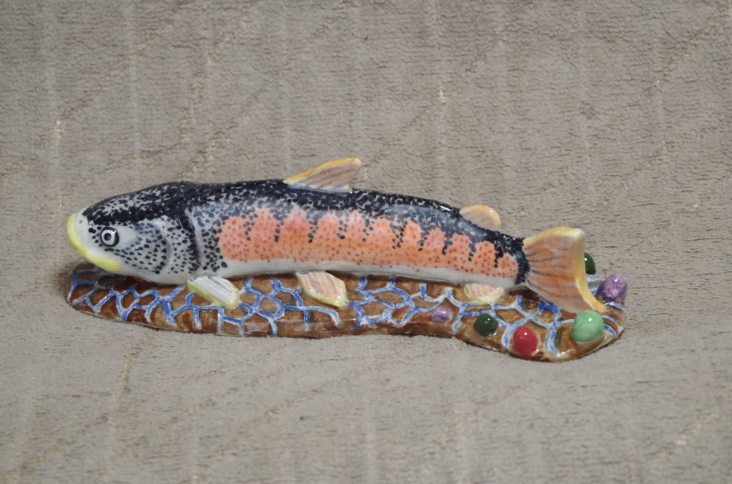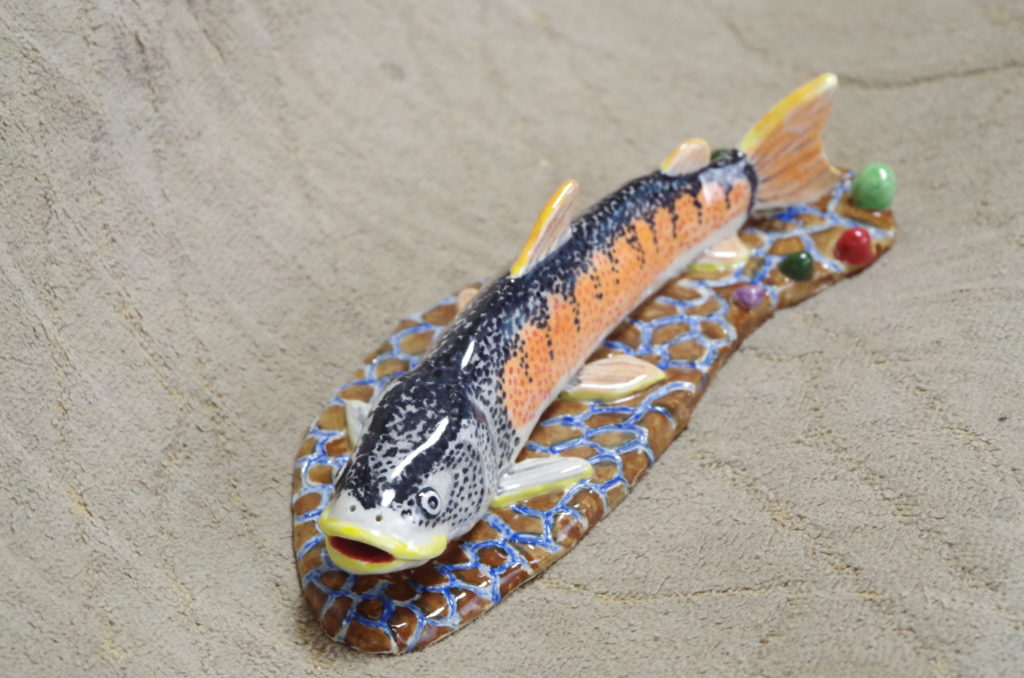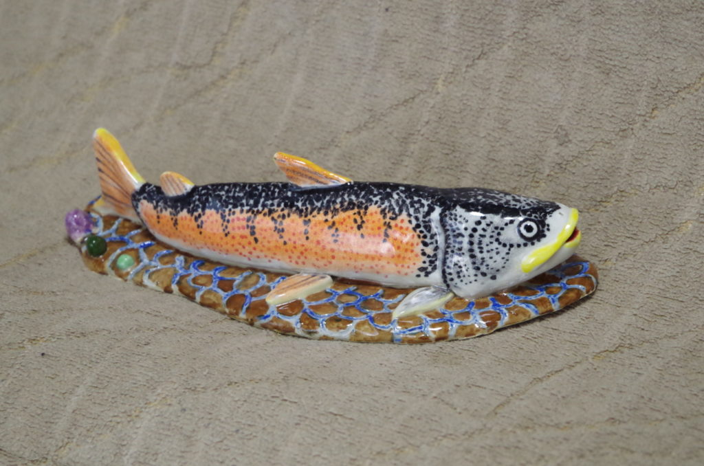 イトウの特徴と言えば、サケ一族らしい顔つきと、量感のある体を揺らしながら悠然と泳ぐ姿だろう。ただ、体色は地味なので、繁殖期のオスを想定して赤みがかった体にし、全身に広がる斑点模様は点描にして、リアルに表現した。全体に緩い表現になったが、これが魚体の大きさを表現することとは別の問題で、難しいところだ。【2025年制作】