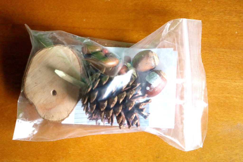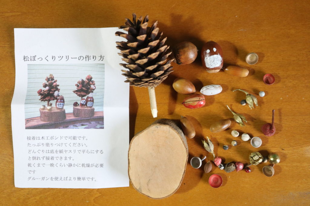 この中には、樹木に仕立てた松ぼっくり、木の幹を輪切りにした土台、大小のどんぐりの果実と殻斗、様々な種子や、種子を放出した後の枯れた果皮などが、一部は彩色され、組み立てマニュアルとともに袋詰めされていた。なかなか手間のかかるセットを、多数準備していただき感謝したい。
