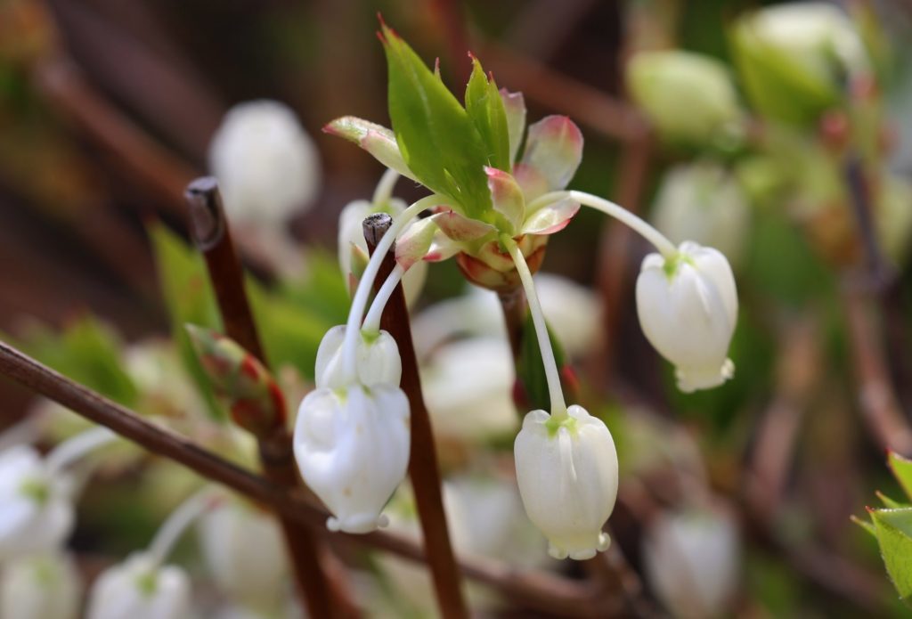 春になると、赤茶色い芽鱗に覆われた冬芽が膨らみ、表面が割れてくる。やがて、蕾と若葉が現れる。枝先から芽鱗を乗り越え、長い花柄を介して、下向きに散形花序を構成する。花序には数個の花がつき、花は白い壺形花冠を持つ。花冠には5つの稜があり、萼片も深く5裂する。花は両性花で、中央の長い雌蕊の周辺に、10本の雄蕊があり、葯の先端が2裂する。花粉を運ぶのは、小さなハナバチやハナアブのようだ。ドウダンツツジは枝分かれが多いためか、大量の花がつくため、花の満開期は、樹木全体が白く見える程だ。
