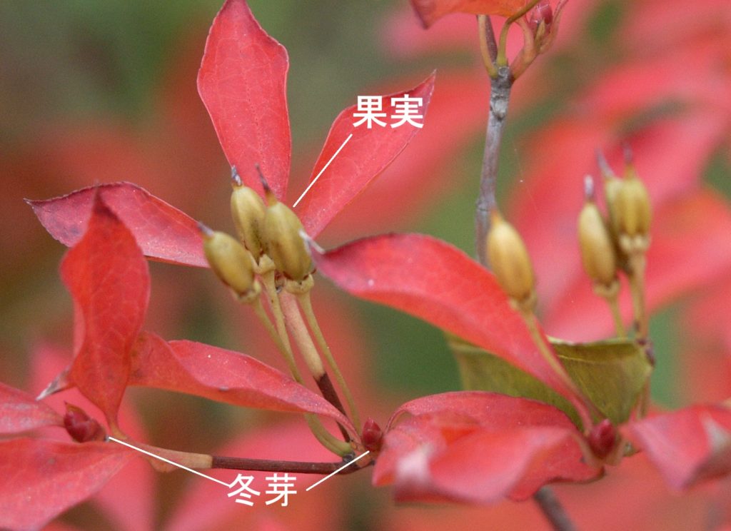 花が終わると、長楕円形の果実が上向きにつき、果皮は緑色から茶色に変化する。果実は蒴果で、秋に熟して多数の種子を放出する。ドウダンツツジの繁殖方法は、この種子を使った実生は時間がかかるので、植栽では挿し木による方法が一般的のようだ。また、秋の果実は熟成する頃には、赤茶色い芽鱗に覆われた冬芽も現れる。