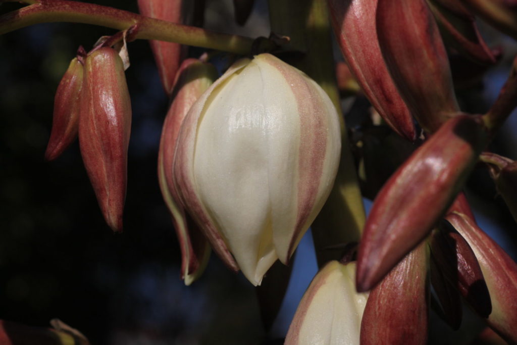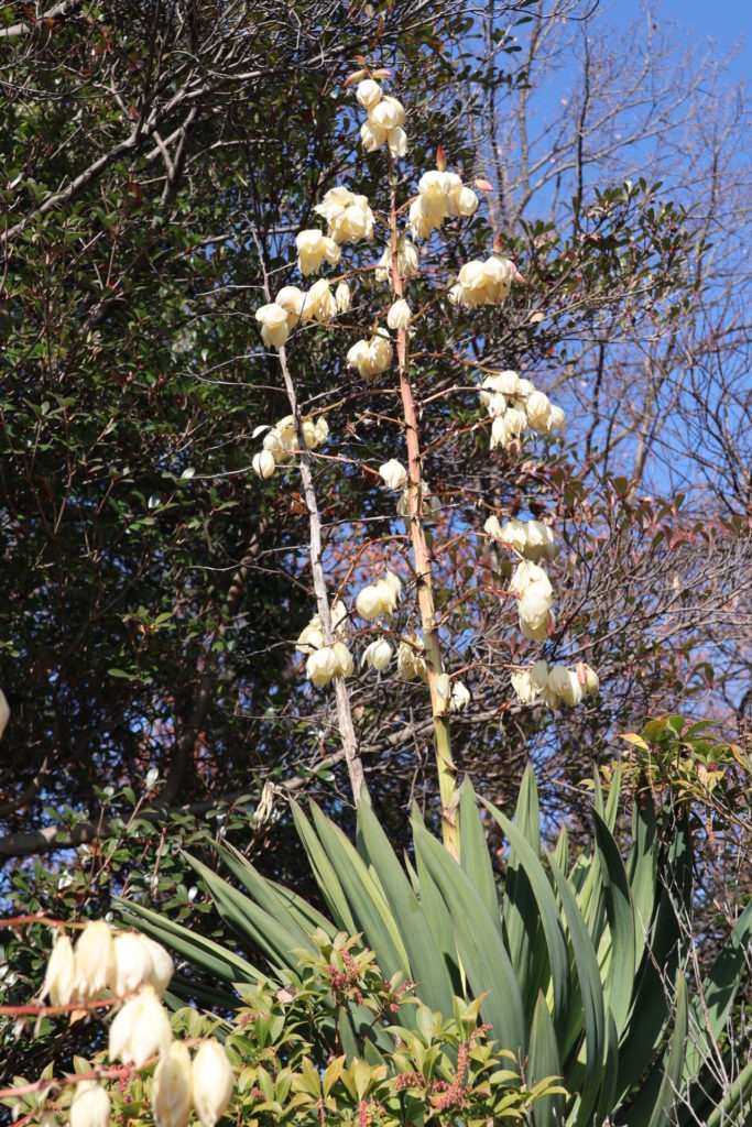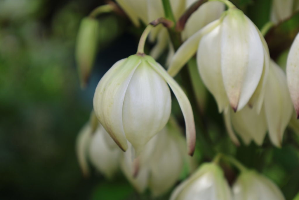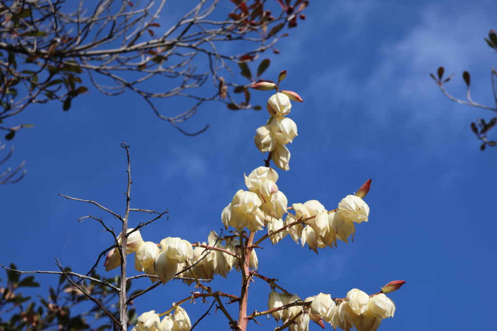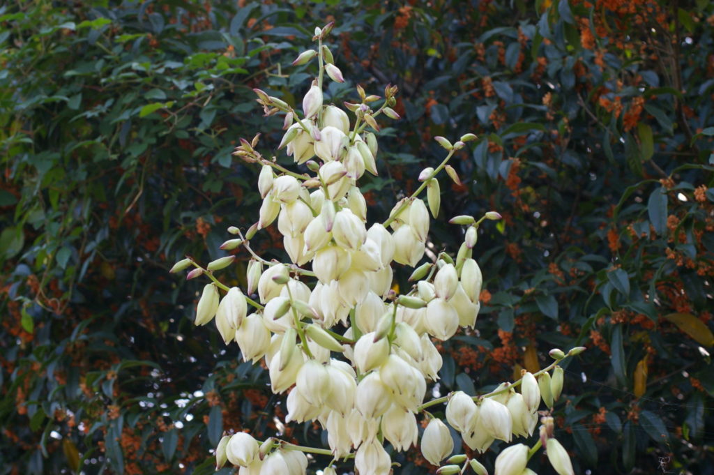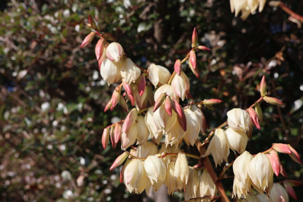 花は、春と秋の二季咲き。春の花は白いが、秋の花は淡紅色を帯びる傾向がある。蕾は細長く、最初は上向きにつくが、開花が近づくと下向きになる。開花すると、直径は数cmに膨れるが、開口部は小さく、内部を観察するのは容易でない。花弁は6弁で、雄蕊は6本、雌蕊は1本だが柱頭は3裂する。雄蕊の花糸は折れ曲がり、葯がやや離れたところにつく。このような構造でも、原産地ではユッカ蛾が上手く花粉を運んでくれたのだろう。花の最盛期には、大きな釣鐘型の花が多数下向きにつき、なかなか壮観だ。