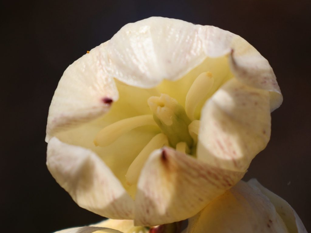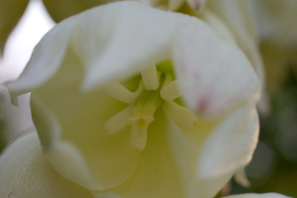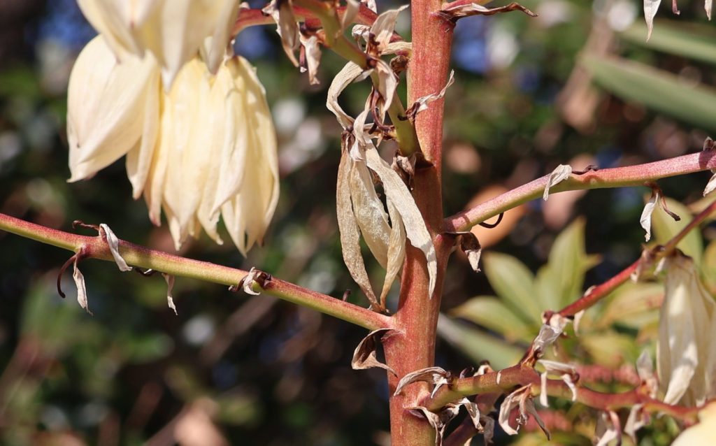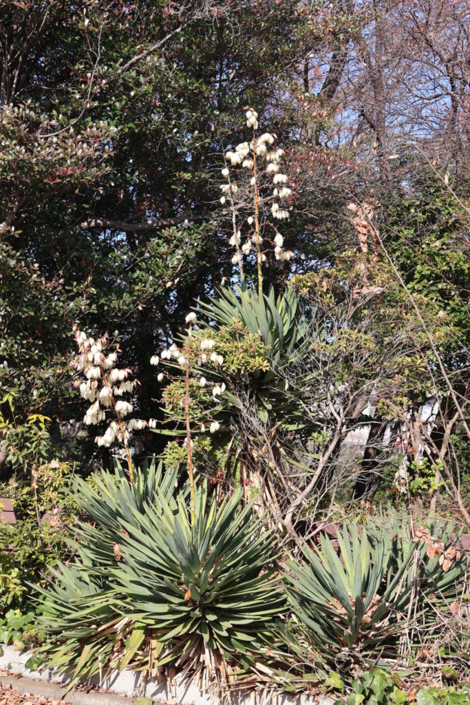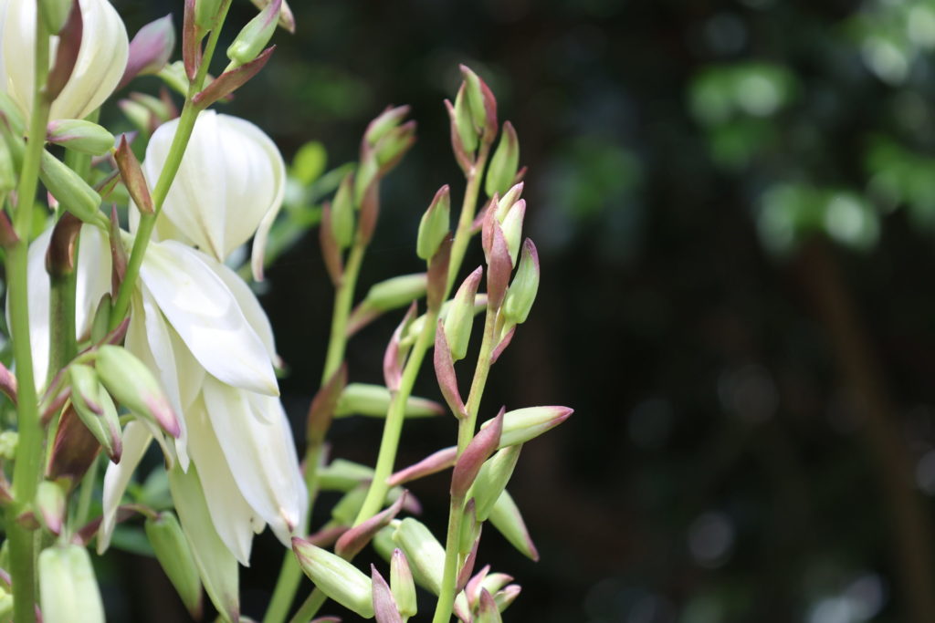 花は、春と秋の二季咲き。春の花は白いが、秋の花は淡紅色を帯びる傾向がある。蕾は細長く、最初は上向きにつくが、開花が近づくと下向きになる。開花すると、直径は数cmに膨れるが、開口部は小さく、内部を観察するのは容易でない。花弁は6弁で、雄蕊は6本、雌蕊は1本だが柱頭は3裂する。雄蕊の花糸は折れ曲がり、葯がやや離れたところにつく。このような構造でも、原産地ではユッカ蛾が上手く花粉を運んでくれたのだろう。花の最盛期には、大きな釣鐘型の花が多数下向きにつき、なかなか壮観だ。