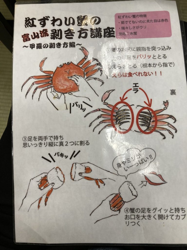 さて、いよいよ夕食。富山のブランド蟹"高志の紅ガニ"ことベニズワイガニ1杯とブリの刺身やしゃぶしゃぶなど。ベニズワイガニは茹でた状態で出されたので、蟹の捌き方のマニュアルに従い、鋏と蟹スプーンで悪戦苦闘しながら、蟹肉を取り出す。甲羅内部の肉やミソ、脚や爪の中までほじくりだすと30分は掛かる孤独な作業だが、蟹肉を頬張る前の至福の時間でもある。ビールとともに、先ず一口、蟹肉は柔らかく、甘みがある。ついでに地酒3種飲み比べセットも追加。何れも芳醇だったが、後味は今ひとつ、純米酒ではなさそうだ。