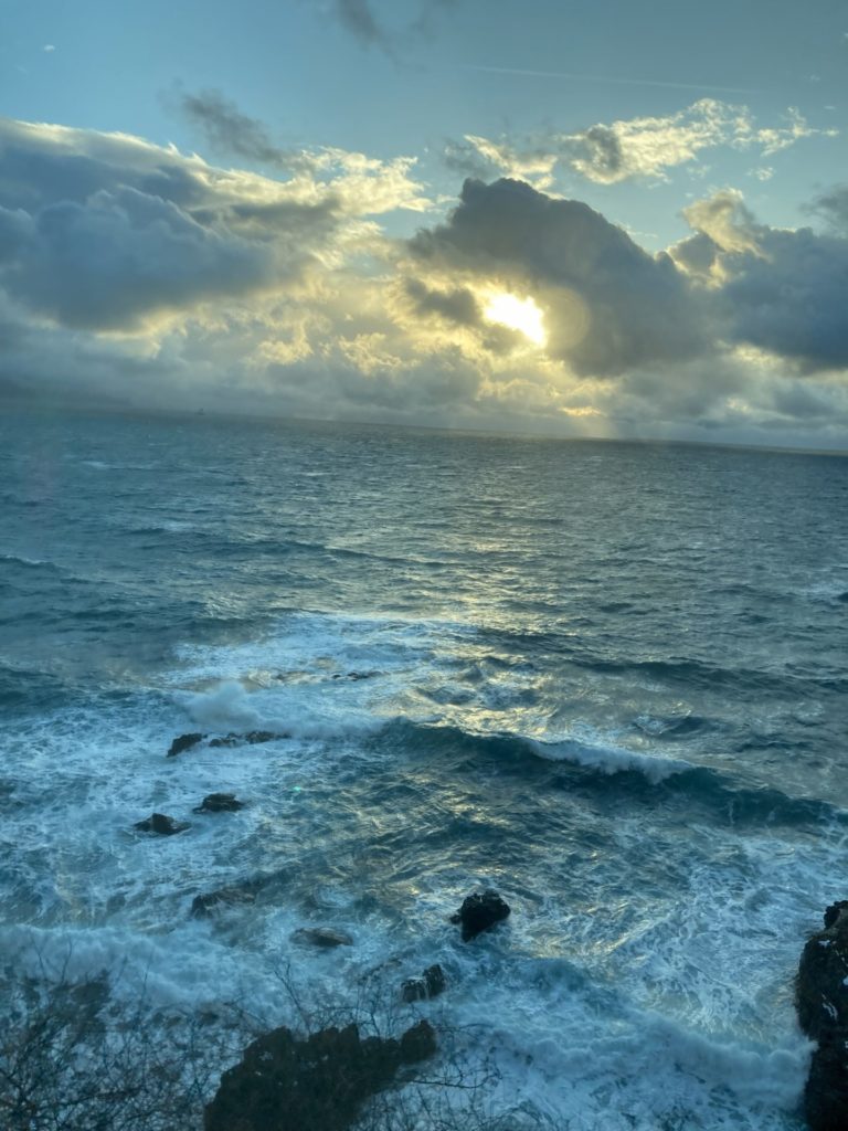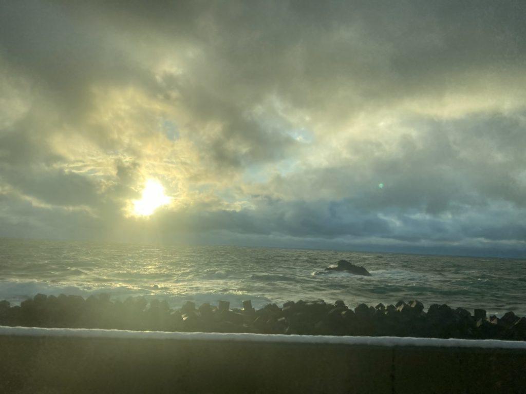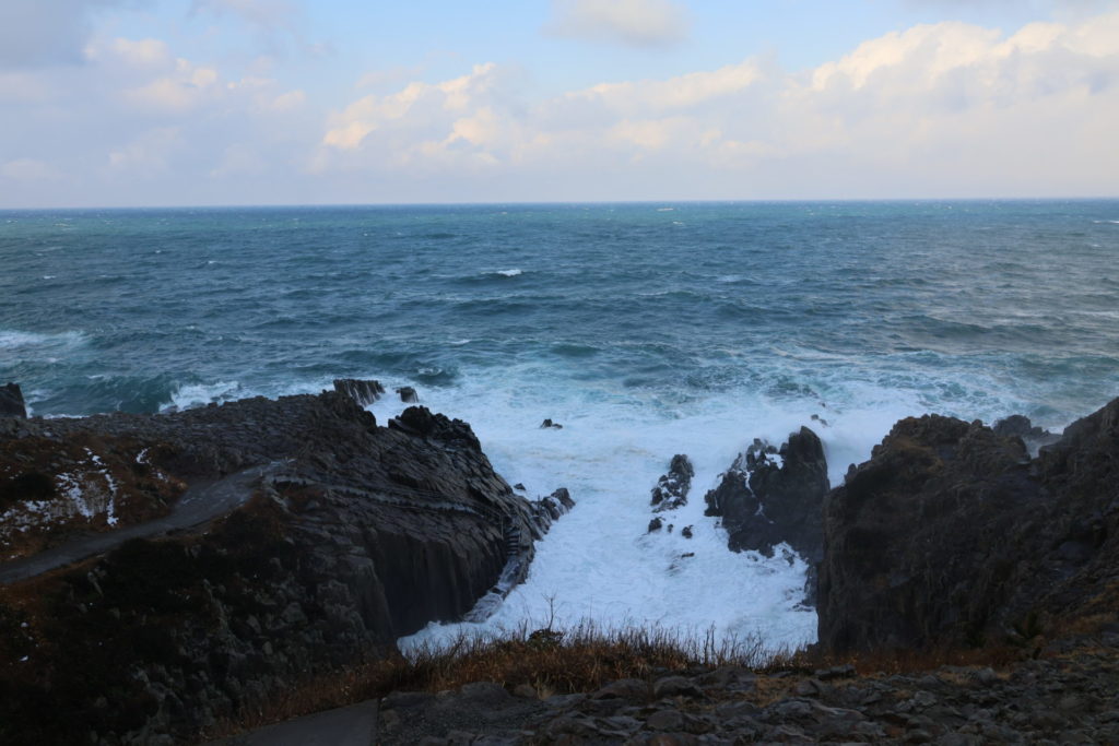 近江町市場を出発し、バスは南下して北陸自動車道の武生ICで降りて予定通り一般道へ。北陸自動車道は降雪のため、武生から先は通行止めになり、危ないところだった。バスは山を超えて越前海岸を北上して行く。この頃には夕方になり、流れる雲の合間から傾きかけた太陽が輝き、海には幾重にも波が押し寄せ海岸の岩を洗う。荒涼とした風景だが、何か印象派の絵画を思わせる。