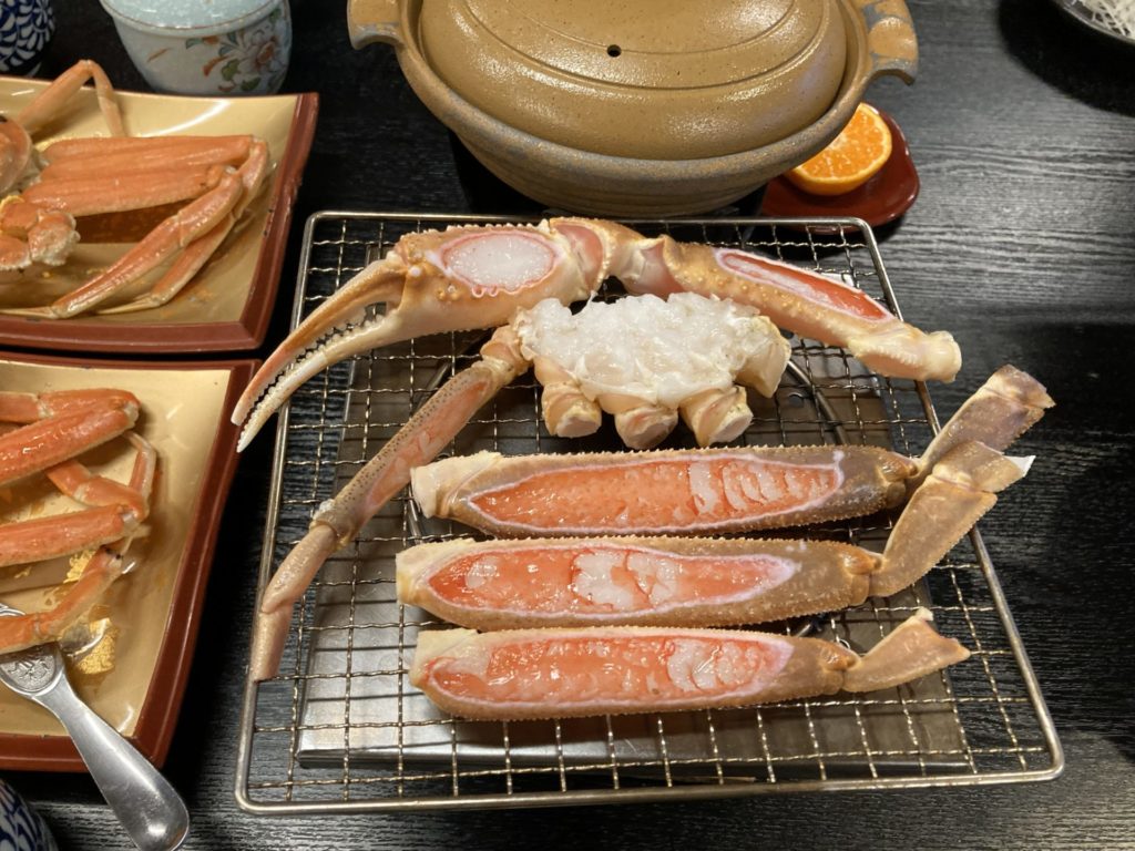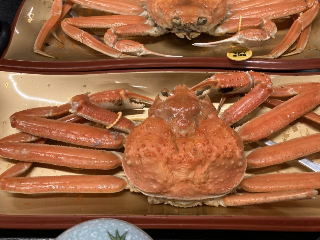 夕食は、料理旅館の2階にある食堂で2杯分の越前ガニが食べられるのがセールスポイント。越前ガニは分類学上はズワイガニで、福井県の越前海岸で獲れるものをブランド化したもの。食卓には、越前ガニであることを証明するタグ付きの茹でた越前ガニが1杯、約半身の焼きガニ、他に茶碗蒸し、蟹グラタン、刺身、蟹雑炊などで合わせておおよそ2杯分で、蟹三昧を楽しんだ。ズワイガニはベニズワイガニより甘く身がしっかりしていると言われているが、宇奈月温泉で食べたベニズワイガニと比較しても、顕著な差は感じられない。猫に小判なのだろう。夕食後、宿泊のため東尋坊温泉へ移動。