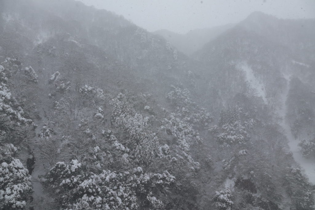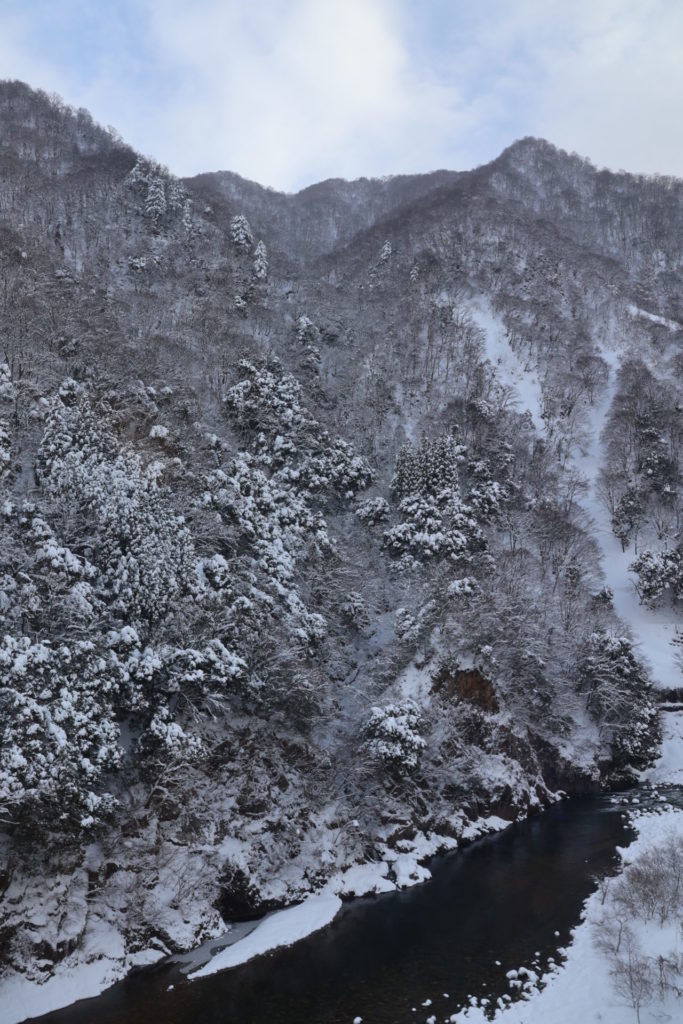 北陸新幹線を黒部宇奈月温泉駅で下車し、富山地方鉄道本線で終点の宇奈月温泉駅に向かう予定だったが、生憎の降雪で電車が運休し、且つクマ出没の連絡もあり、急遽バスで行くことになった。宇奈月温泉は、黒部川の渓谷沿いに旅館が立ち並び、黒部峡谷鉄道のトロッコ観光の出発点でもある。旅館に着くと、部屋の窓から黒部川の渓谷とそれに沿って連なる山々に雪が降り注ぎ、かすれた墨絵のような風情だ。翌朝に一時的に雪が止んだときは、鮮明なモノクロームの絵になっていた。