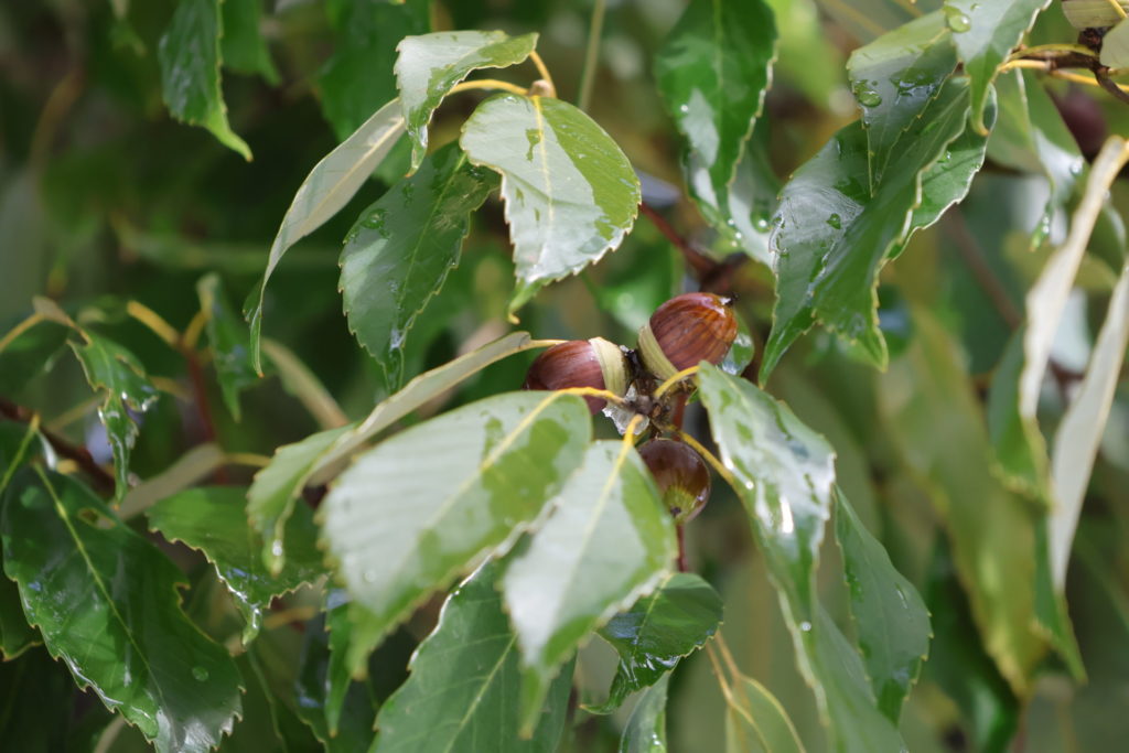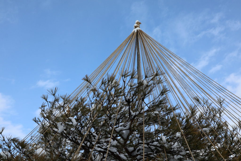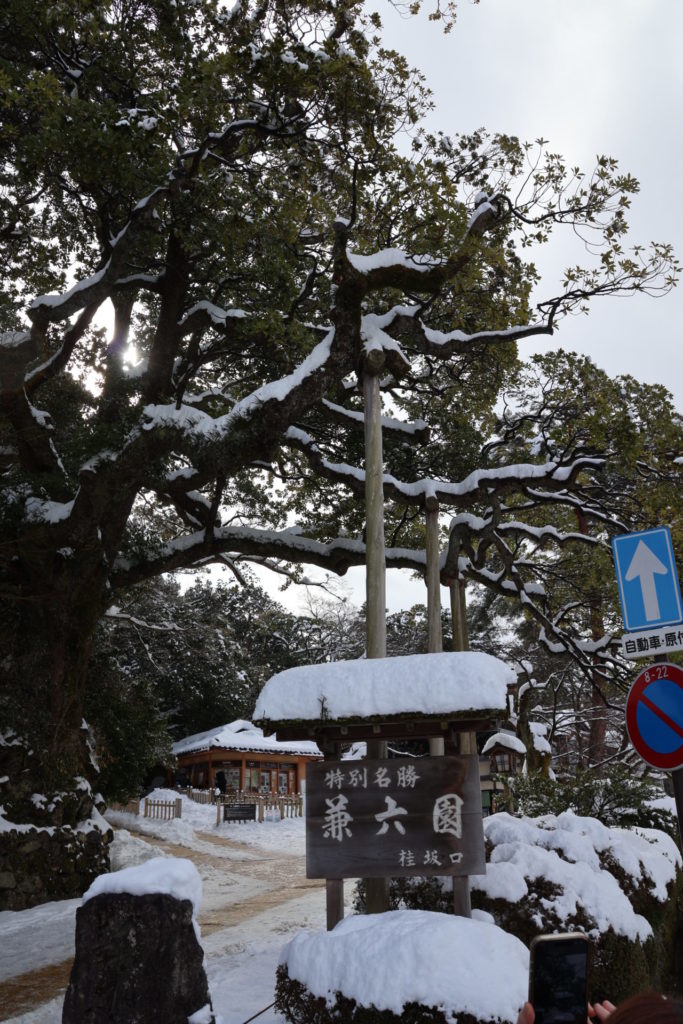 2日目の前半は、バスで宇奈月温泉から金沢市内に移動し、兼六園、金沢城、近江町市場を観光。雪は断続的に降ったり止んだりで、足元はシャーベット状の雪で危うい。先ずは兼六園だが、雪景色は初めて。桂坂口から入り、徽軫(ことじ)灯籠や霞ヶ池、その周辺にあるクロマツを覆う雪吊を見物。灯籠や石、樹木の上には雪が積もり、池面は半ば溶けた雪で覆われている。これぞ冬の兼六園の景色だ。園内には、未だ落ちていないアラカシのドングリや、春を待つヒサカキの蕾が雪の試練に耐えていた。兼六園の入場者は、海外の観光客も含め多くて混雑してきたので、早々に隣接する金沢城に移動した。