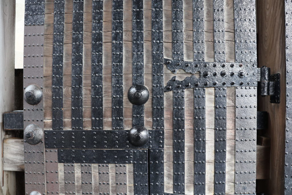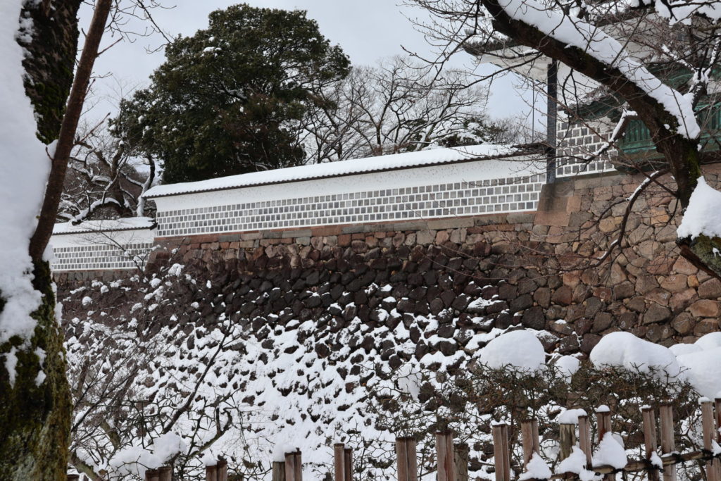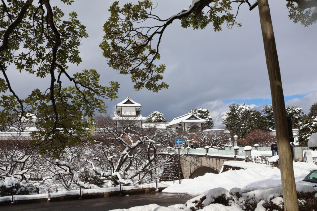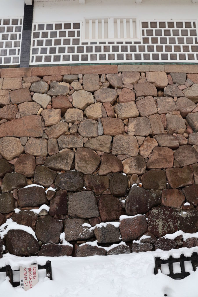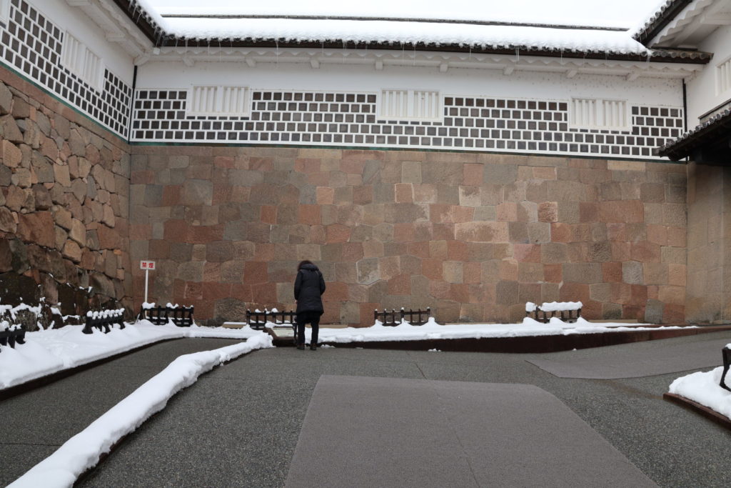 金沢城へは、石川門口より入場。石川橋を渡り右に曲がると、立派な石川門がある。金沢城の搦手口(裏口)にあたり、構造は升形門で、両開きの門扉には実用的で簡素なデザインが施され、城郭建築らしい風格があり、国の重要文化財になっている。また、石垣の石積み技法も様々だ。石川門に続く石垣は、隙間なく石材が並べられ表面は平坦な切石積み技法だし、石川門に対面する石垣は多少隙間を許容した粗加工石積み技法であり、外堀に相当する石垣は自然石積み技法で表面も凹凸なので雪も積もる。築城の時期や、場所の重要度で使い分けたのだろう。石川門から場内に入ると、三の丸広場が広がり、その奥に菱櫓、五十間長屋、橋爪門続櫓が連なっている。その背後に仮屋根の覆われた二の丸御殿が復元中だ。金沢城内には、かつて陸軍司令部が置かれたり、金沢大学の丸の内キャンパスがあったりしたが、現在は遺構が復元されつつあり、昔の姿を取り戻そうとしているように思える。