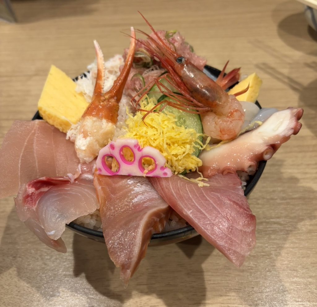 兼六園、金沢城を見学した後は、近江町市場に移動し、自由行動で昼食の時間。現在の近江町市場は入り組んだ通路の上に交通案内板が至る所に設置され、目的の店に行き易くなった。市場には2階や地下もあって、食堂や日用品の店舗があることに、今回初めて気が付いた。市場散策の関心事は蟹の価格だが、高いもので3万円、安いもので2杯で1万円程度で、大きさも種類も異なるので、適正価格かどうかは見当もつかない。さて、昼食だが、蟹の目利きが出来ないのと、ホテルの朝食がバイキングで鱈腹食べた後なので、結局刺身食堂でランチ価格の海鮮丼にした。魚の身は厚く、種類も多かったので充分満足した。