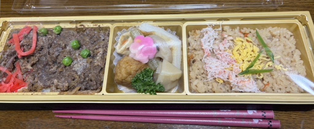 加賀市の九谷満月を出発して、バスは金沢駅に向かう。ここで新幹線に乗車するが、なんとお土産に金沢の老舗料亭の"かにめしと能登牛しぐれ丼"をいただいた。帰途は雪による時間調整のため上越妙高駅で20分程度待機しただけで、無事に帰還。自宅でビールとともに、お土産の弁当を完食し、3日間の旅行が終了した。