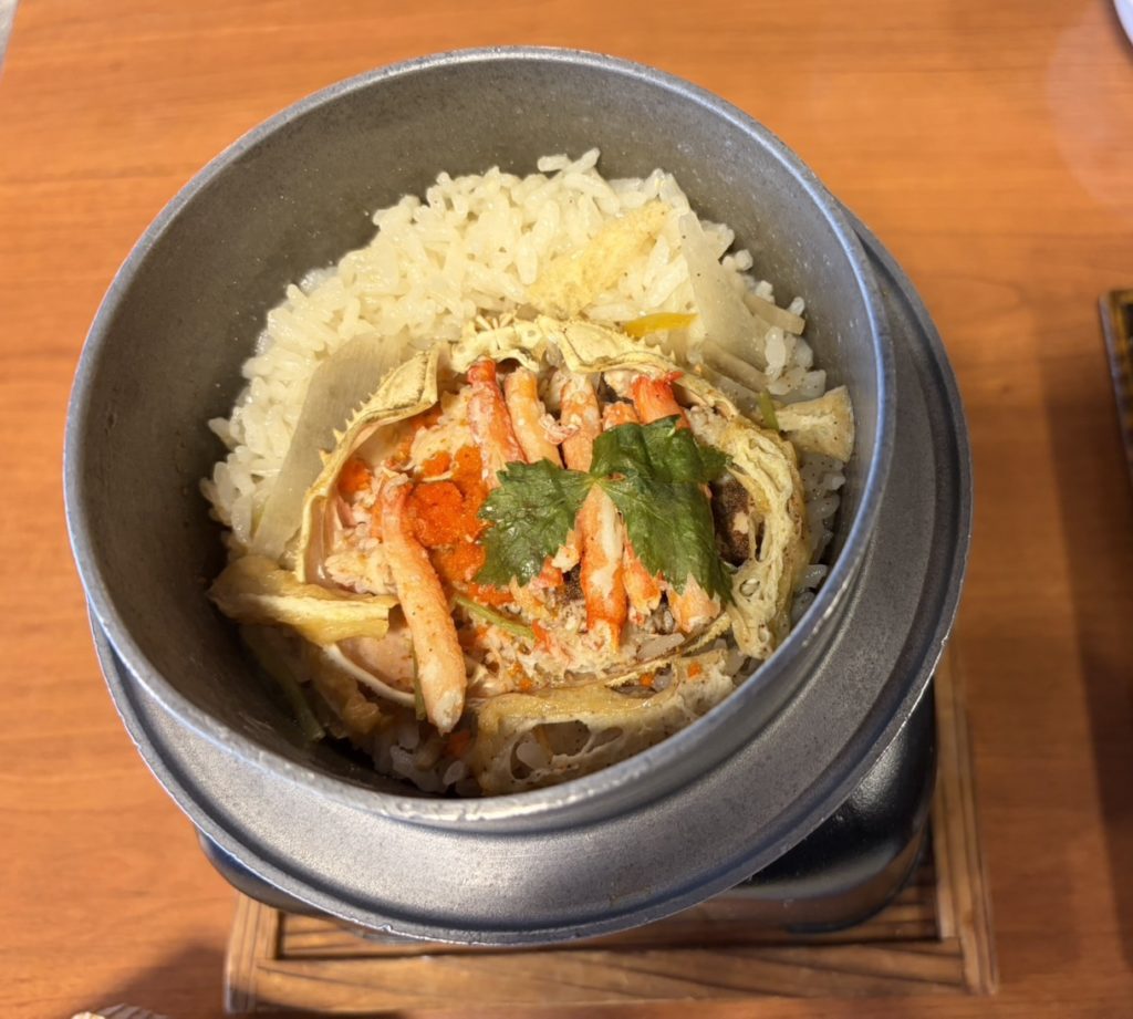 店舗の2階が食堂になっており、石川県のブランド蟹"香箱ガニ"の蟹ご飯などを味わった。香箱ガニはズワイガニの雌で、甲羅にたっぷり詰まったオレンジ色の未成熟卵"内子"と、腹部に抱えたつぶつぶの卵"外子"を持つ季節限定の食材だ。これを釜に入れて米とともに炊くと、濃厚な蟹ご飯になる。大変美味しかった。また、自分へのお土産は、ご飯がへばり付かないように表面を凸凹にエンボス加工した杓文字があるが、飯碗の内側にエンボス加工したものがあったのでこれを買った。なかなか良いアイデアだ。
