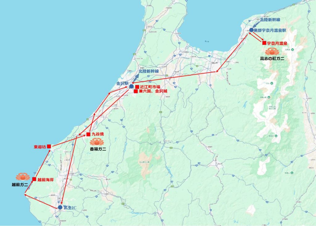 本場のカニ料理を食べたいと思いつき、1月下旬の団体旅行"北陸3県のブランド蟹食べ比べ3日間"を予約した。これは、富山県の"高志の紅ガニ"(ベニズワイガニ)、福井県の"越前ガニ"(ズワイガニ)、石川県の"香箱ガニ"(雌のズワイガニ)を食べ歩く旅だ。旅行期間中は、運悪く低気圧が日本列島を覆い、北陸地方には大雪注意報が発令されていた。それでも恐れ知らずの蟹食い集団は、新幹線に飛び乗った。3日間の旅程は下図の通り。