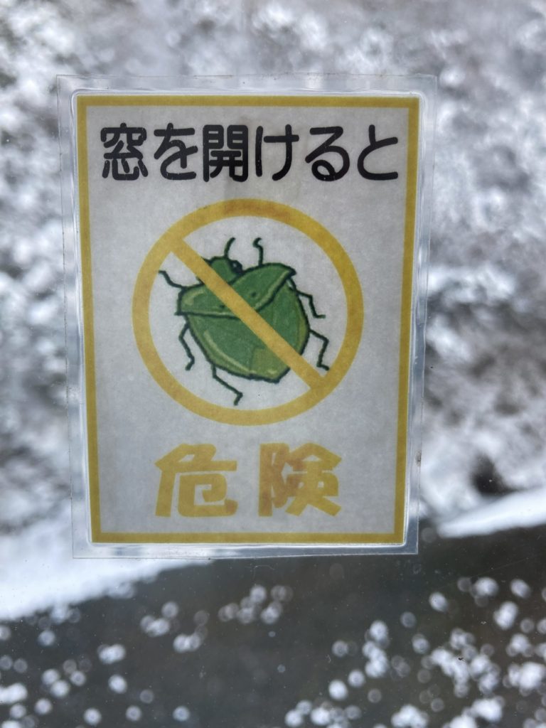 また、窓ガラスに珍しいものを発見した。窓を開けるとカメムシが侵入するので開けないようにとの表示だが、近くにはガムテープが置いてあり、もし侵入したらこれで駆除して欲しいとのこと。昨年は、異常高温のためか関東地方でもカメムシが大量発生したが、この様な山奥でも同様だったようだ。