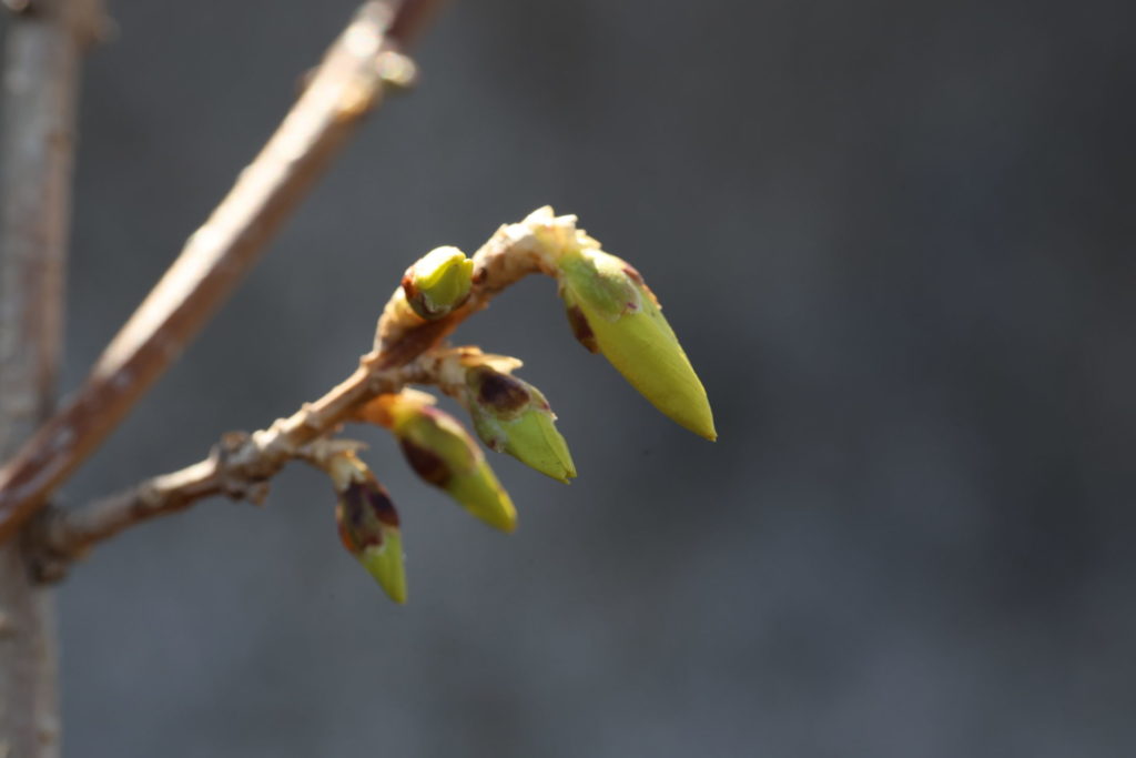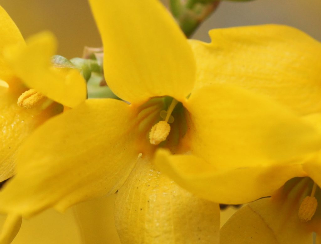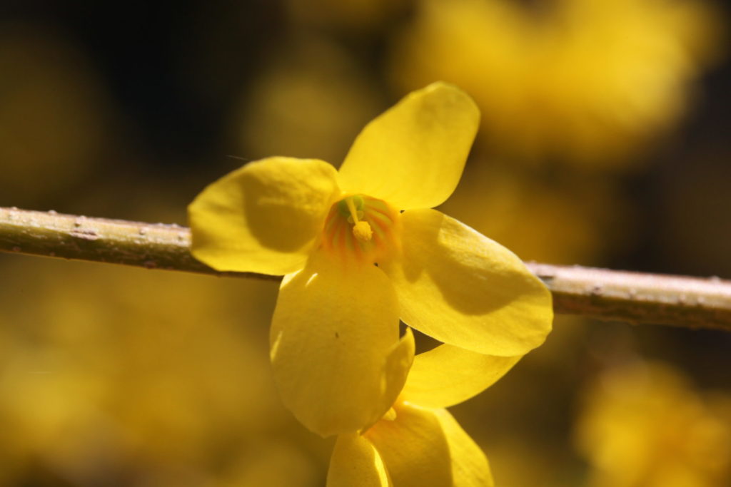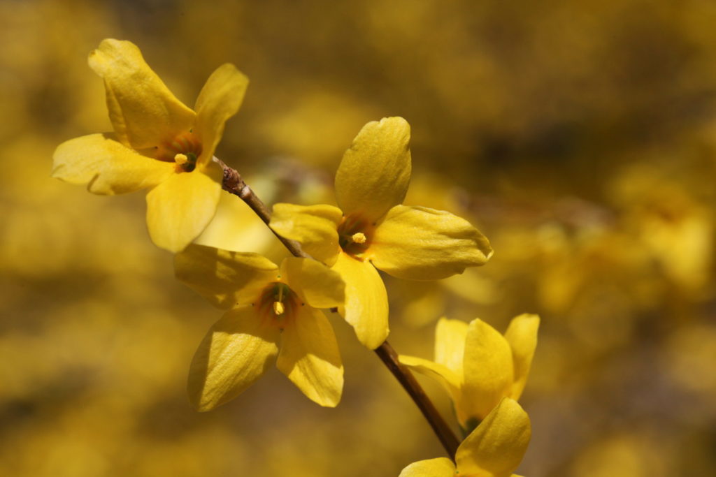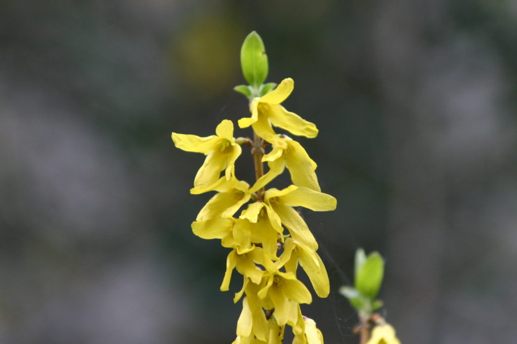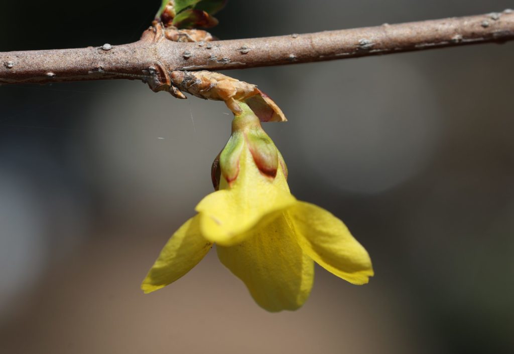 春になると、冬芽の花芽が成長し、黄色くなって蕾となる。開花すると、花は黄色の合弁花で、深く4裂する。正に、英名の "Golden Bells"を彷彿させる。4枚の萼は楕円形で、花弁を支え、短い花柄につながっている。