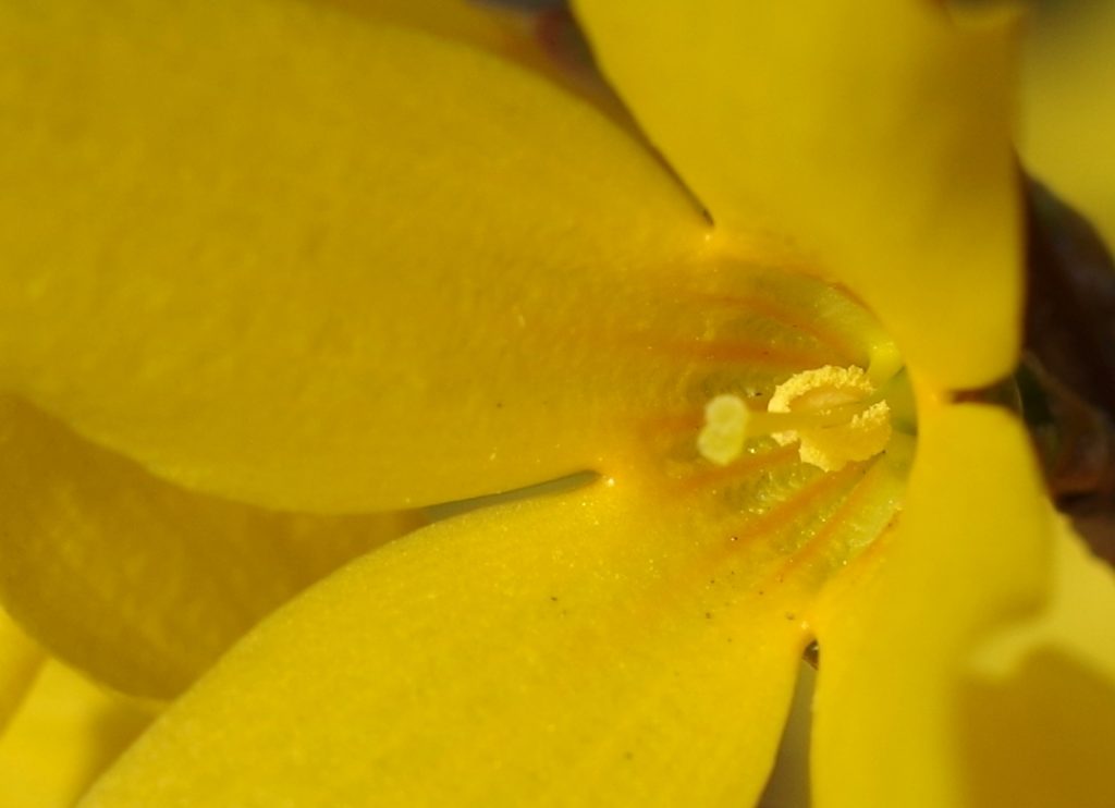 ここからが、ややこしくなる。レンギョウは雌雄異株なので、雄株には雄花が、雌株には雌花がつく。雄花の役割は、雄蕊で花粉を放出する葯を花の中心に突出させて、昆虫の体に触れ易いようにすること。このとき、雄花の雌蕊は雄蕊の葯より低い位置に2裂した柱頭があり、受粉の機能があるのかは不明だが、極力昆虫と触れないようになっている。一方、雌花は雌蕊の2裂した柱頭が高く突出し、その下に2本の雄蕊がある。確かに昆虫がくると雌蕊に触れる機会は多そうだ。そして、雄花も雌花も構成要素は同じで、1本の雌蕊と2本の雄蕊からなり、両性花に近いが、雄蕊と雌蕊の位置関係が異なる。この構造だと雌花は自家受粉はしないのだろうか、雄蕊と雌蕊の成熟時期が少しずれるのだろうか…など、疑問は残る。しかし、そんなことにお構いなく、満開のレンギョウの花は、桜の満開時期と重なり、すっかり代表的な日本の春の景色になってしまった。