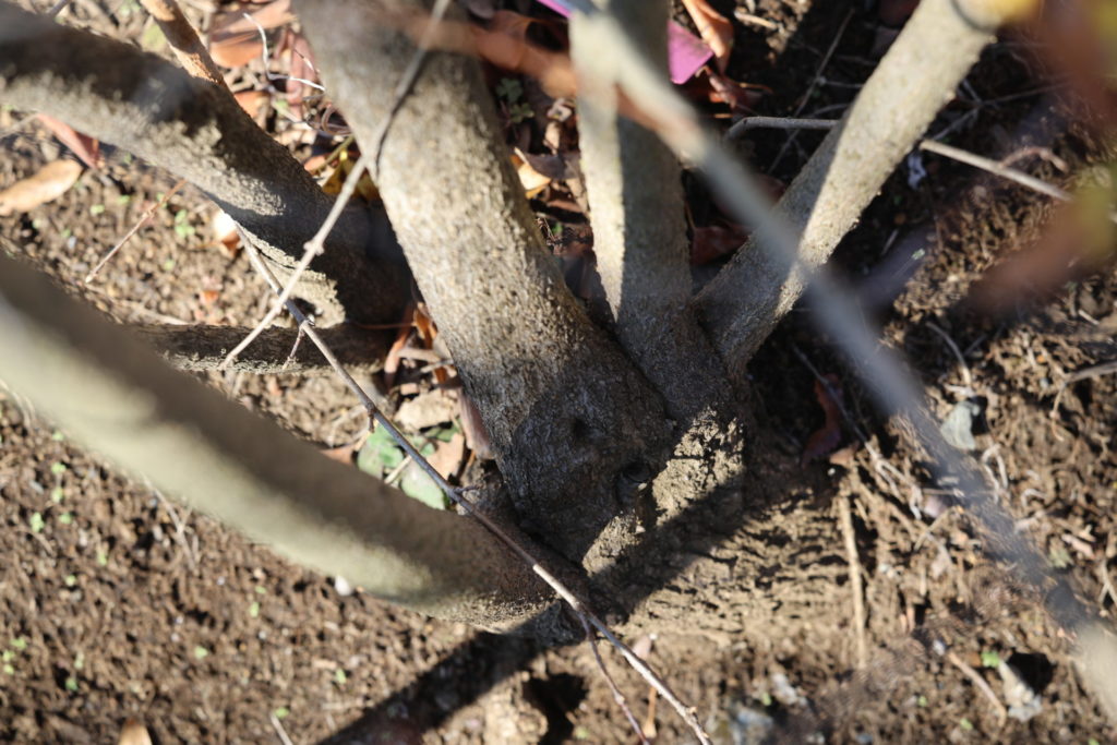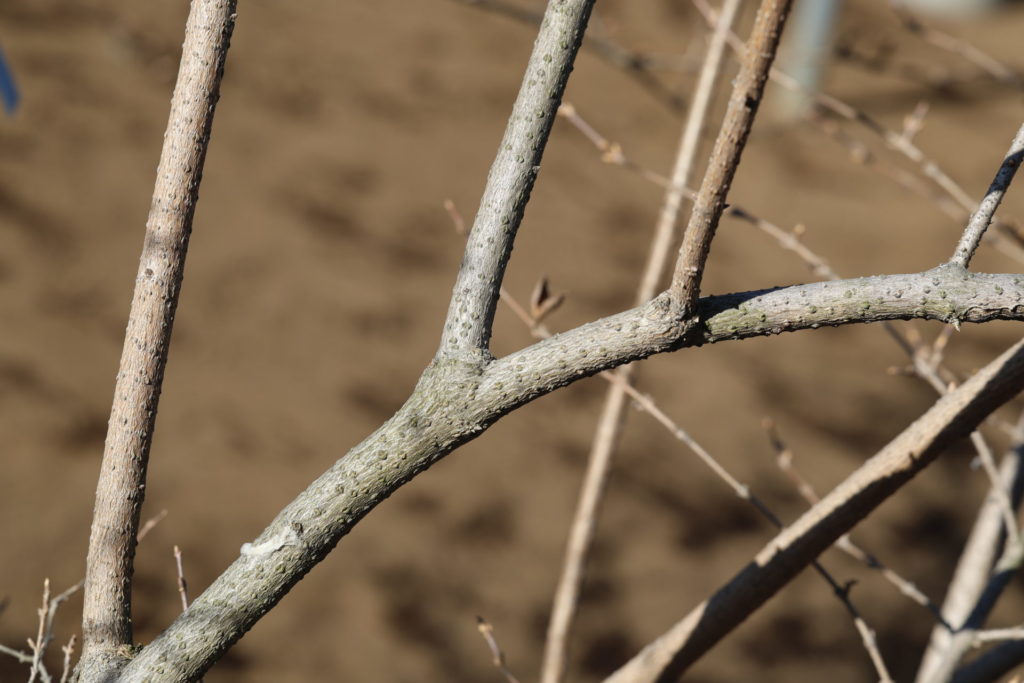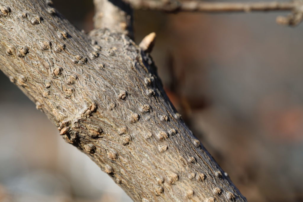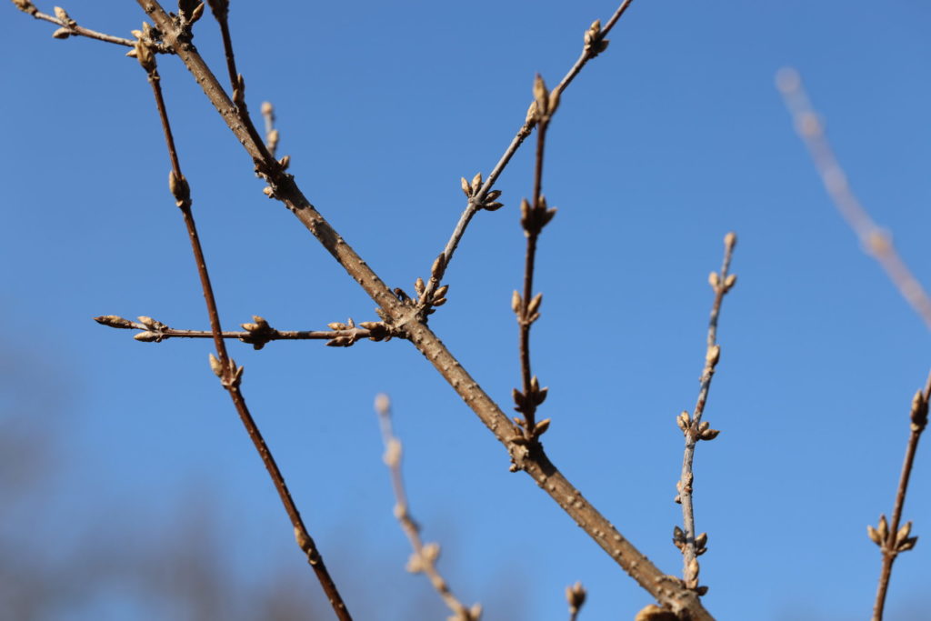 雌雄異株で、株立ちして樹高は1~3mになる。繁殖力が旺盛で、半つる性の枝が湾曲して垂れ下がり地面に接触すると、そこからも根を出す程だ。しかし、公園や庭に植栽されるレンギョウは、強剪定されて樹形は整形されるので、自然樹形の株を見る機会は少ないかもしれない。地面から数本の幹が株立し、幹の樹皮は灰褐色で、膨らんだ皮目がつく。よく分枝し、枝は節を除いて髄が中空になるので、”連翹空木”の別名もある。冬芽は楕円体で枝に対生し、葉芽は小さく、花芽は大きい。花芽は、数枚の芽鱗に包まれている。葉痕は半円形で、1個の維管束痕が残る。春になると、冬芽の花芽が開花し、花が咲き終えると、入れ替わるように黄緑色の若葉が出る。葉は広卵形で先端が尖り、疎らな鋸歯がつく。葉の色は、次第に濃緑色になり、やがて秋になると茶色や紫色を帯びる。