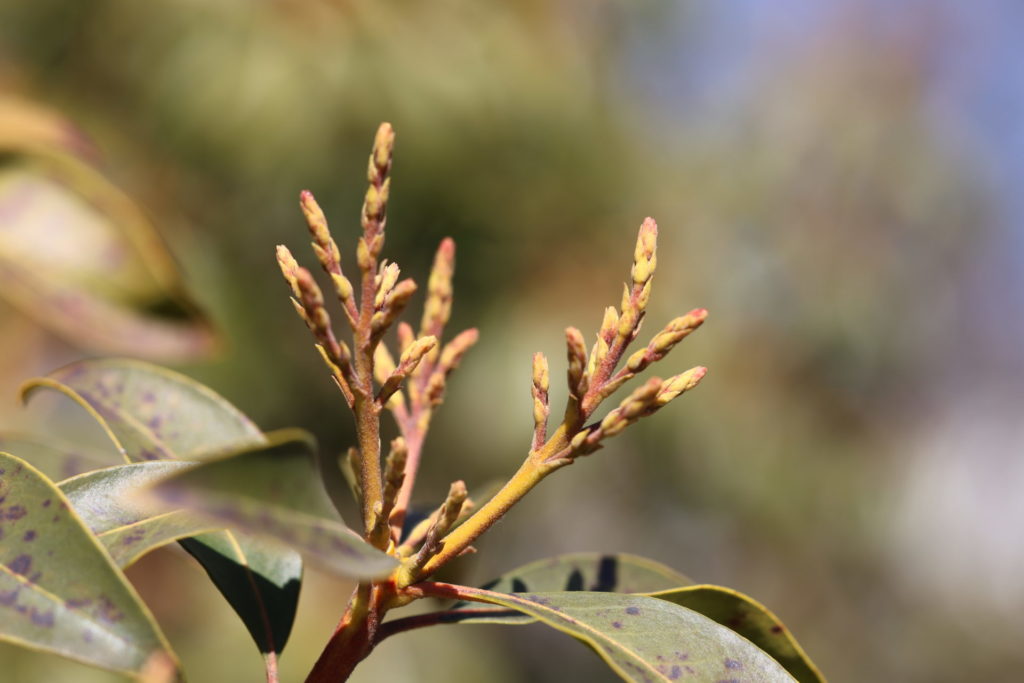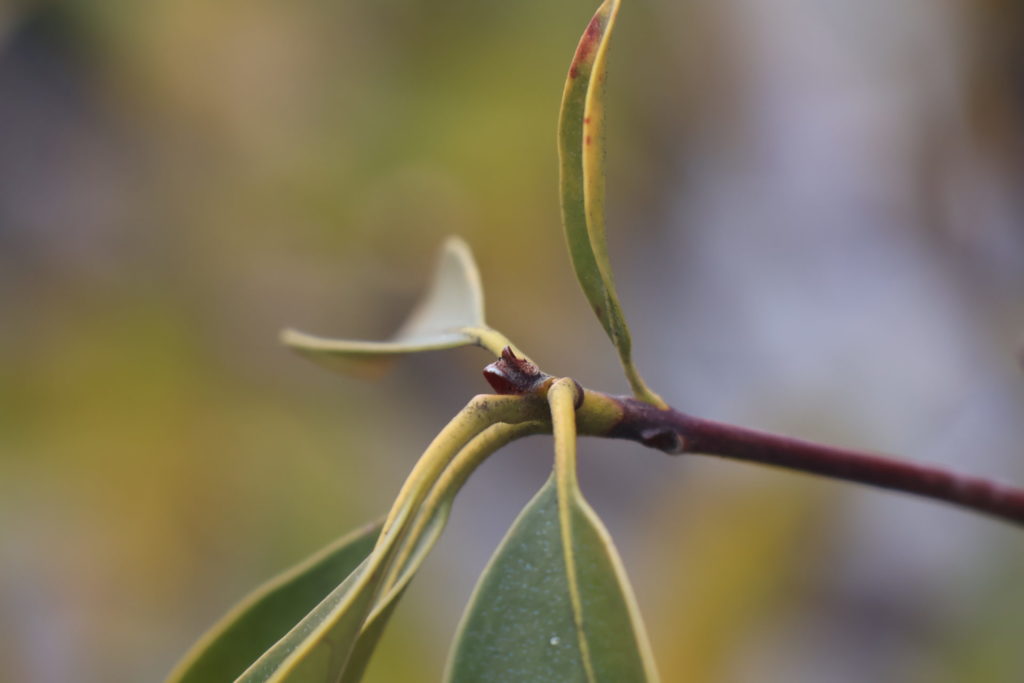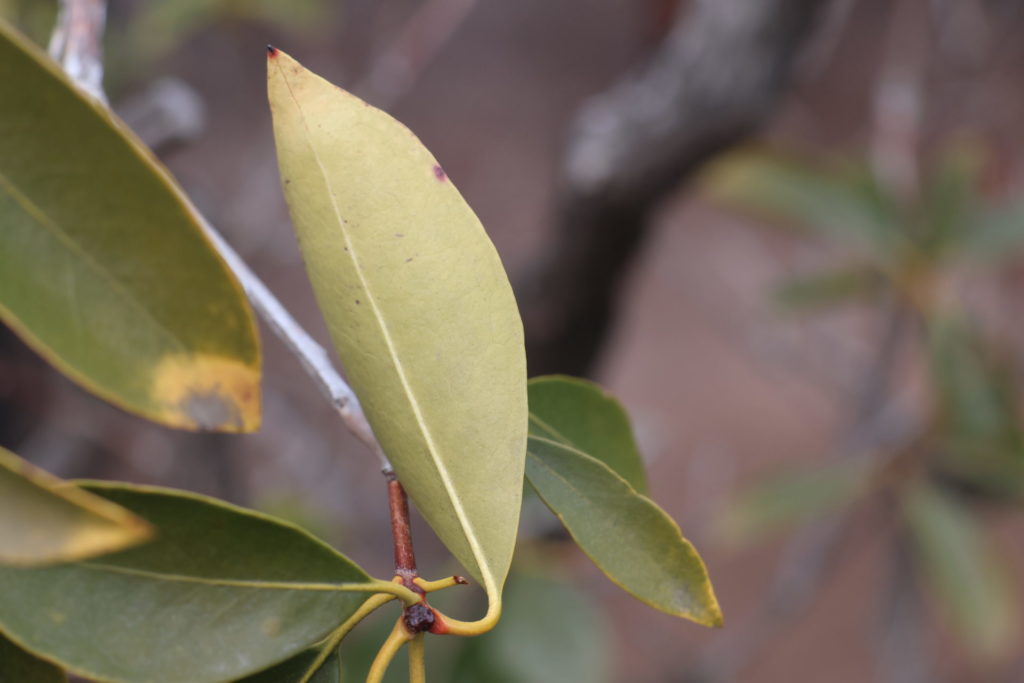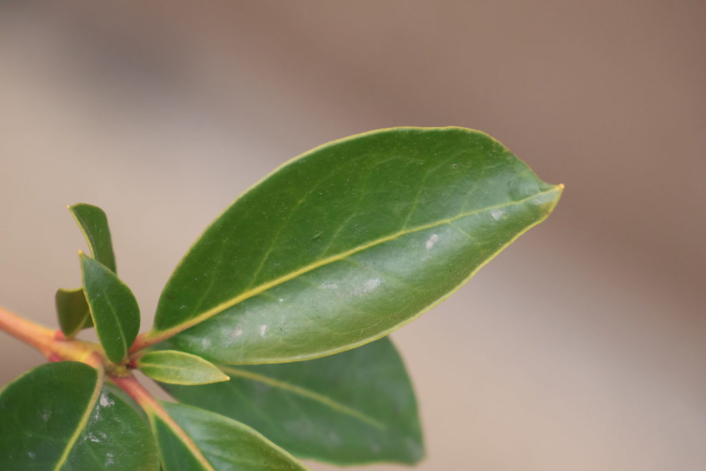 葉は互生するが、枝先に集中して螺旋状になる。葉は披針形で、表面は革質で光沢があり、周辺に鋸歯は無く全縁。葉の裏面は、光沢は無く黄緑色を帯びて疎らに薄い毛が生える。