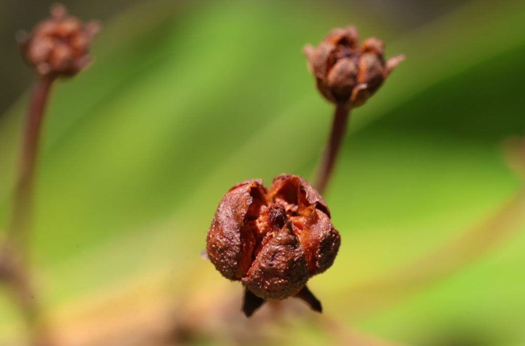 花が終わると、花弁や雄蕊、最後に雌蕊が落ち、果実へと成長する。やがて、細かな毛に覆われた褐色の果実ができる。果実は蒴果で、5つの部分に別れ、やがて裂けて多数の種子を出す。自生地でのカルミアの繁殖方法は、種子による実生が基本だが、地面の状態によっては根茎の伸長による栄養繁殖もあるようだ。園芸植物と繁殖させるには、挿し木や取り木が一般的だ。