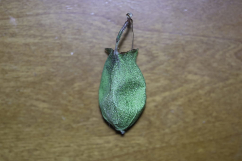 冬になると、落葉樹は葉を落とすので、枝に何かがぶら下がっていると、良く目立つ。まして、それが際立った色だったとしたら、その落葉樹とは別の生物体と考えるのが妥当だ。今回見つけたものは、形状はほぼ楕円体で、大きさは長さ4cmで直径2cm程度。上部は平たく閉じられ、下部には水抜きのような小さな穴が空いていて、鮮やかな黄緑色の物体だ。そして、上部から糸のようなものがあり、これが木の枝に繋がっている。