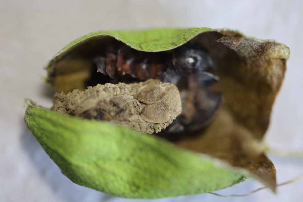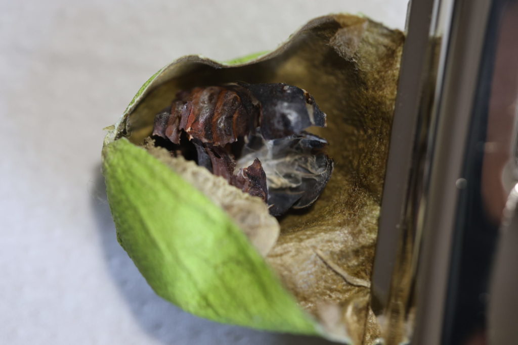 これらの画像を使って検索してみると、これはどうやらウスタビガ(薄手火蛾)の繭の抜け殻らしい。内部はどうなっているのだろうか? 上から下へ鋏を入れて半開してみると、虫の抜け殻が目に入った。頭部や胸部、背中部分は黒褐色、腹部に相当する部分は灰色がかった黄色で、前者は乾燥しており少しでも振動を与えると崩れる位乾燥しているが、後者は多少触れても形は崩れない。繭の中で蛹が成長し、成虫となって繭から外の世界へ飛び出す直前に脱皮をしたのだろう。繭を分解し内容物を並べて見たが、この過程で黒褐色の背中の部分は粉々に砕け、粉末状になってしまった。冬の関東地方は余程乾燥しているためかもしれない。