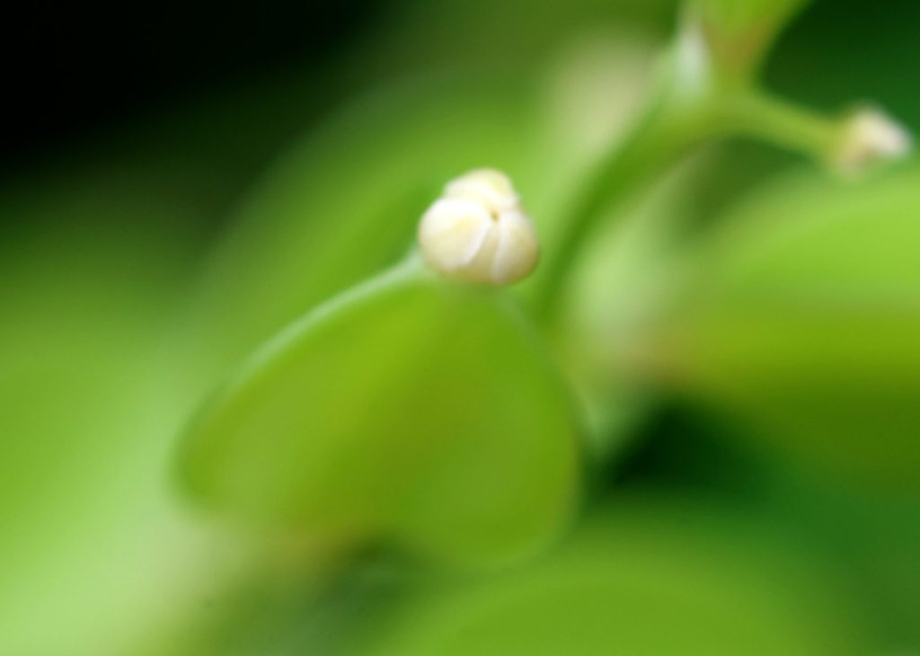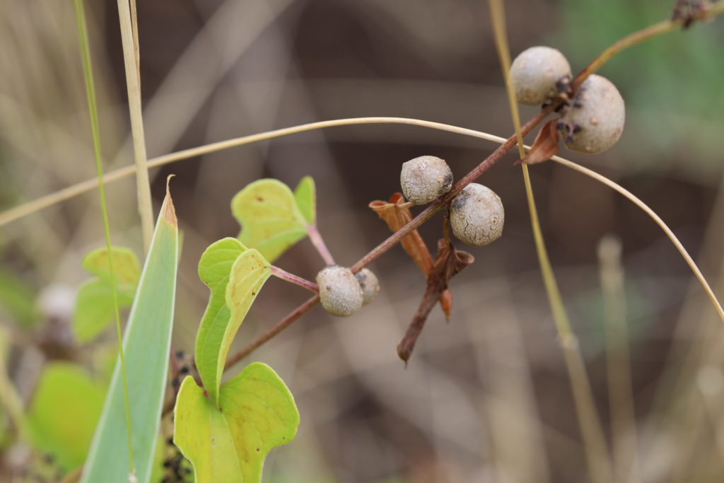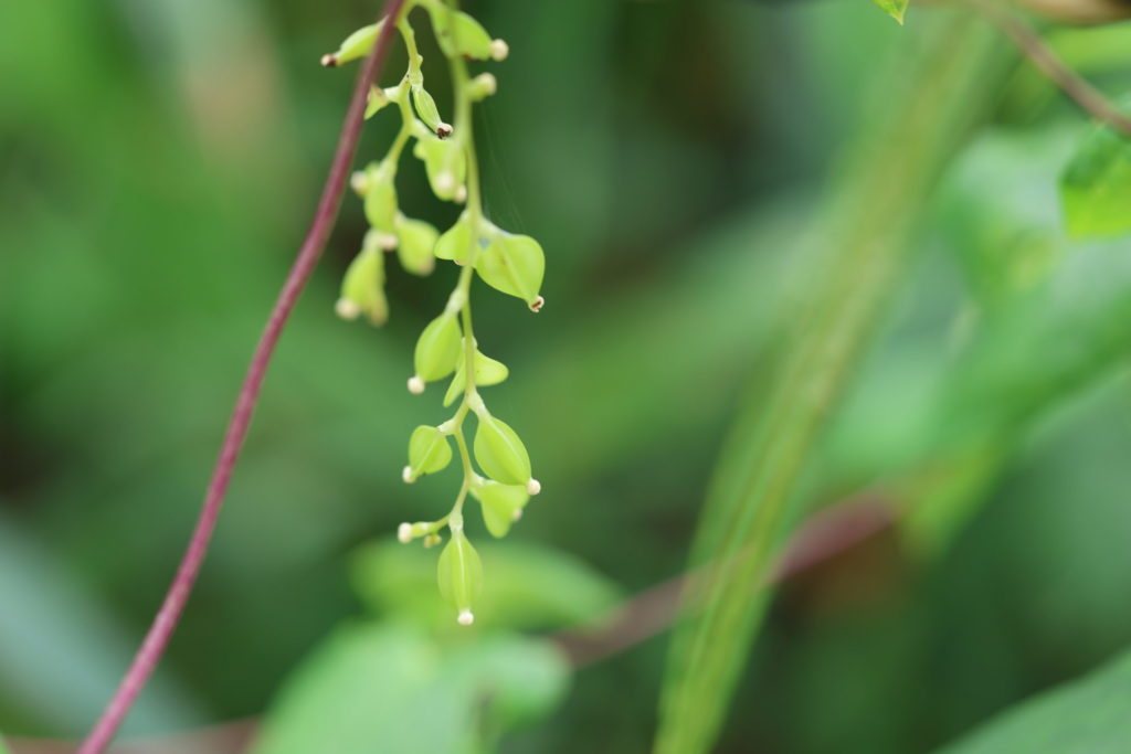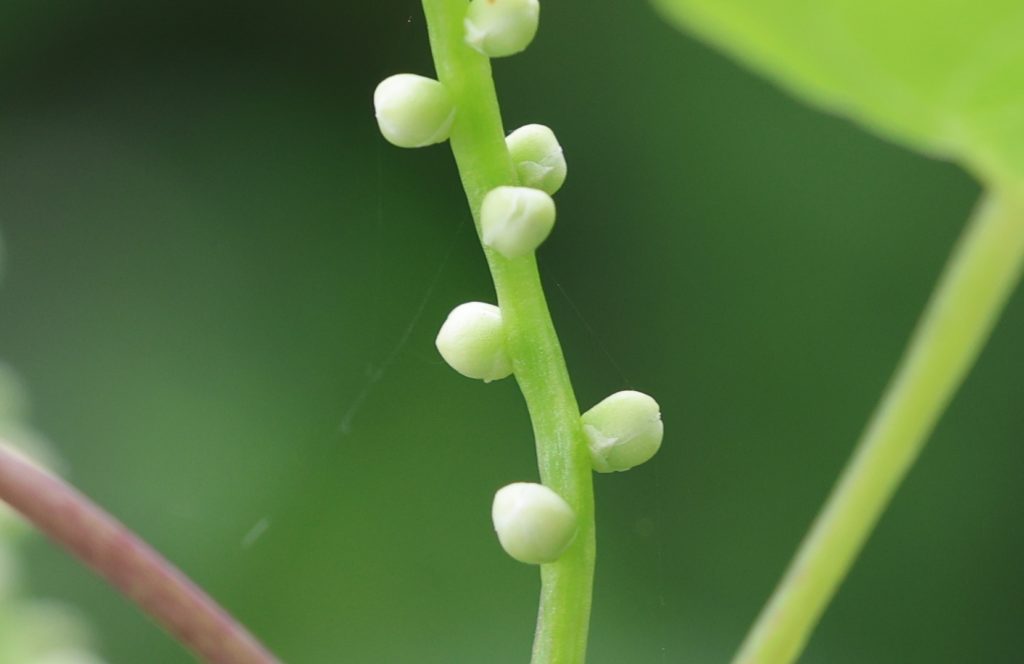 雄株には雄花が、雌株には雌花がつくが、大抵の場合は雄株と雌株の蔓はつるんで伸びていくので、雄花や雌花は近くに存在する。雄花序は、葉の腋から何本かが出て上方に伸び、穂状に多数の白い雄花をつける。雄花はほぼ球形で、白い花被片があるが、これが開いている状態を見られる機会は少ない。一方、雌花序も葉の腋から出てるが垂れ下がり、子房を介して白い雌花がつく。雌花も球形で花被片はあるが、こちらもあまり開かない。これでは、ハチやチョウなどの昆虫による受粉は難しそうだ。通説では、ヤマノイモは風媒花と言われている。雄花と雌花の距離は近いのだが、雄花も雌花もあまり開かないので、受粉出来るの確率はどうなのだろうか?