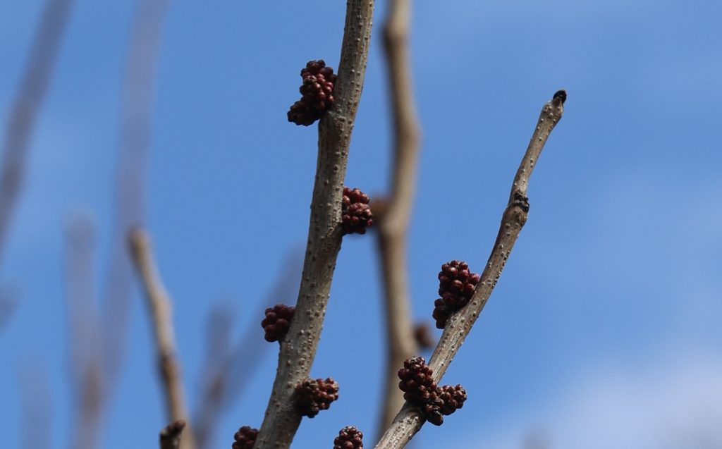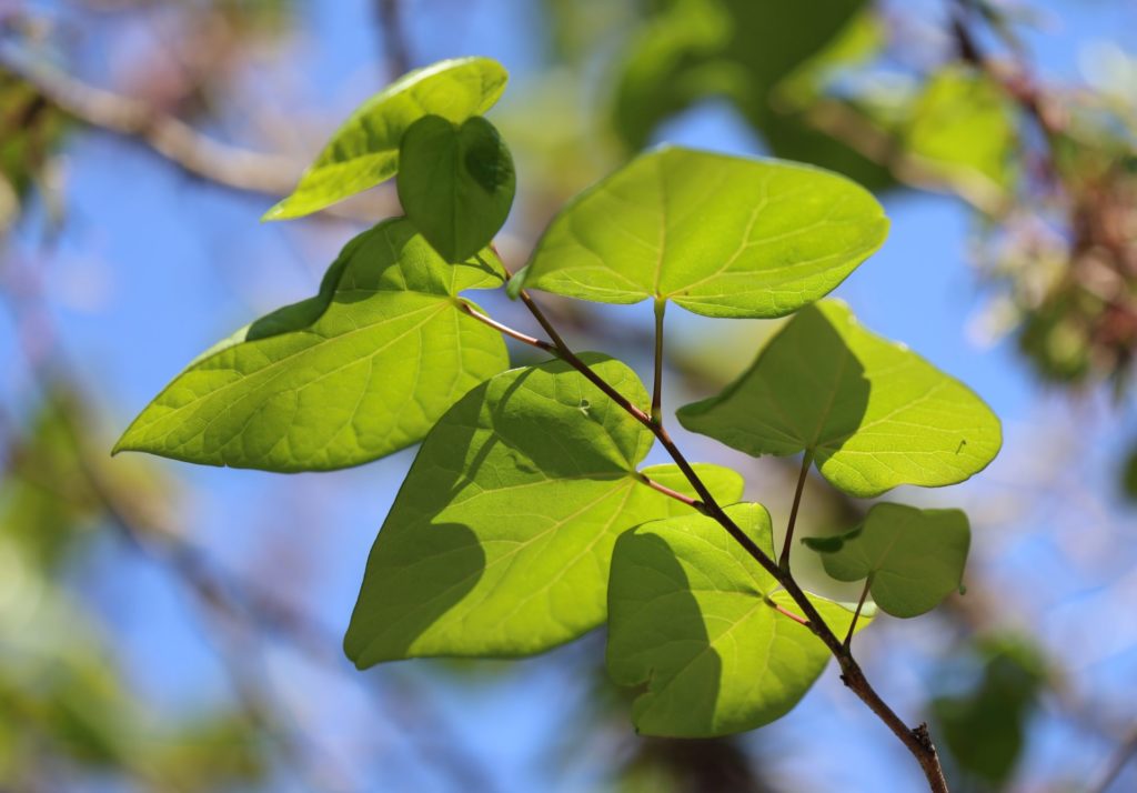 ハナズオウは雌雄同株。幹は複数が株立して、上に伸びる。幹からの枝分かれは少ないので、逆さ箒形の樹形になる。樹高は2~6m程度。幹の樹皮は灰褐色で、滑らかで皮目がある。一方、若い枝はジグザグ状で細い部分は紫色を帯びる。冬芽は、花芽が枝の途中に点在するブドウの房状のものであり、葉芽が枝先付近の小さな卵状のものだ。葉は、互生して葉柄が長く、光沢のあるハート形で、縁は滑らかだが裏に少し反り返り、数本の葉脈がある。