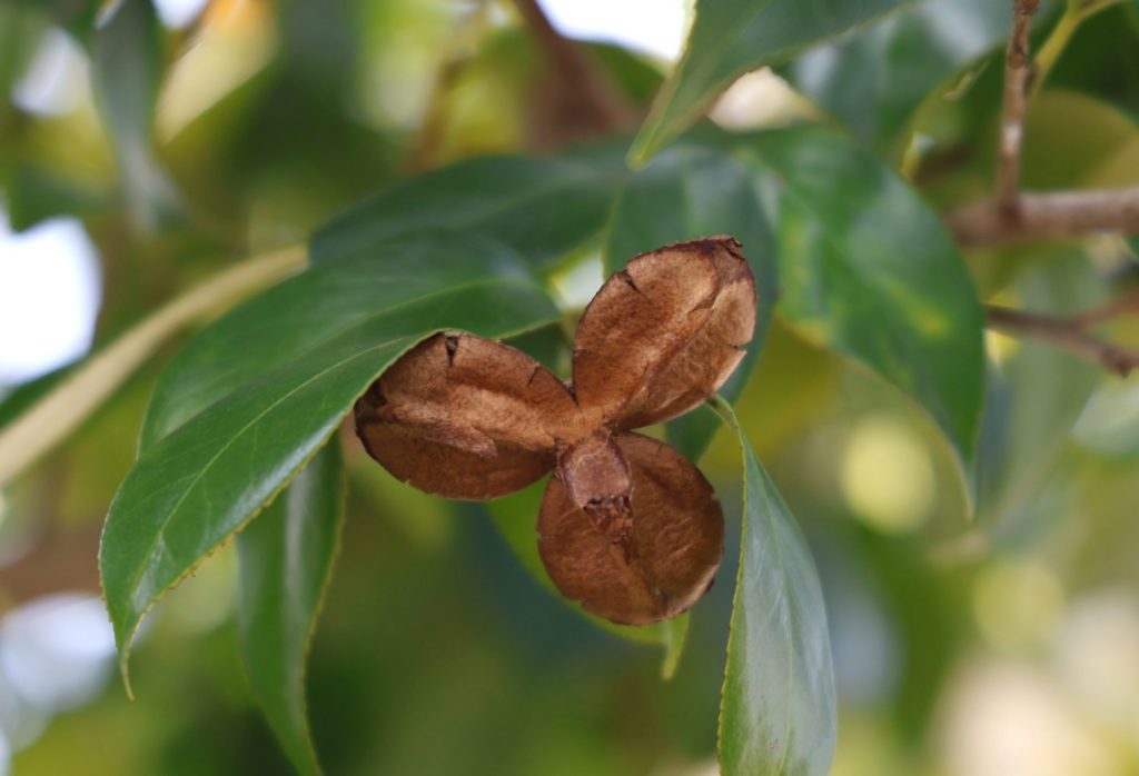 花が終わると、受粉した雌蕊の基部にある子房が生育し、果実になる。果実は球形の蒴果で、果皮は黄緑色から次第に茶褐色を帯びる。果実が熟すと果皮が3裂し、暗褐色の種子が3個程度露出する。これが、椿油の原料にもなる。やがて、種子は割れた果皮から落下し、その後はネズミなどの小動物の貯食行動で拡散する。種子の落ちた果皮は、3裂したまま冬を越すことがある。
