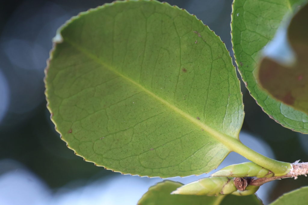 雌雄同株で花は両性花。樹形は横にはあまり広がらず、卵形か円錐形で、高さは5~10m程度までのものが多い。枝分かれが多いので葉の密度は高く、葉が樹木の輪郭を作り出す。幹の樹皮は淡灰褐色で滑らかだが、薄い模様や細かな突起物ができることがある。春に光沢がある紡錘形の葉芽が出て、常緑の葉は新旧交代する。葉は枝に互生する。葉は厚く、葉脈は薄い。葉の形は楕円形で先端が尖り葉縁には細かな鋸歯がある。葉の表面は緑色で艶があるが、裏面は黄緑色だ。